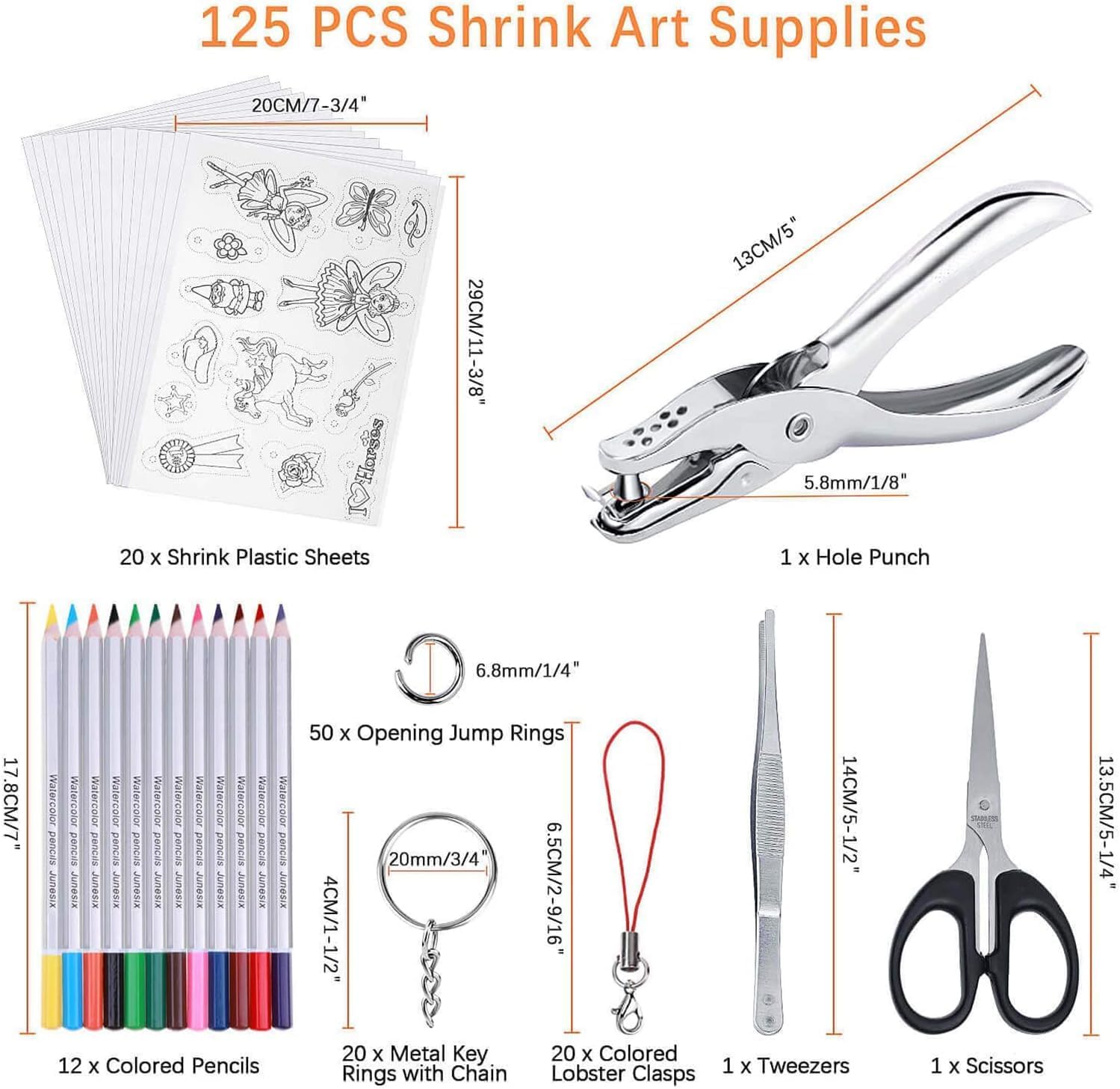 🌸【Great Value Set】 shrinky sheets kit including 15 Pcs blank shrink film paper and 5 Pcs shrinky art paper with pattern, 12 color pencils, 1 pair of scissors, 1 hole punch, 1 tweezers, 20 Pcs chain keyring with chain, 20 Pcs colored lobster clasps, 50 Pcs opening jump rings, it’s enough to make a lot of keychains or jewelry pendant.