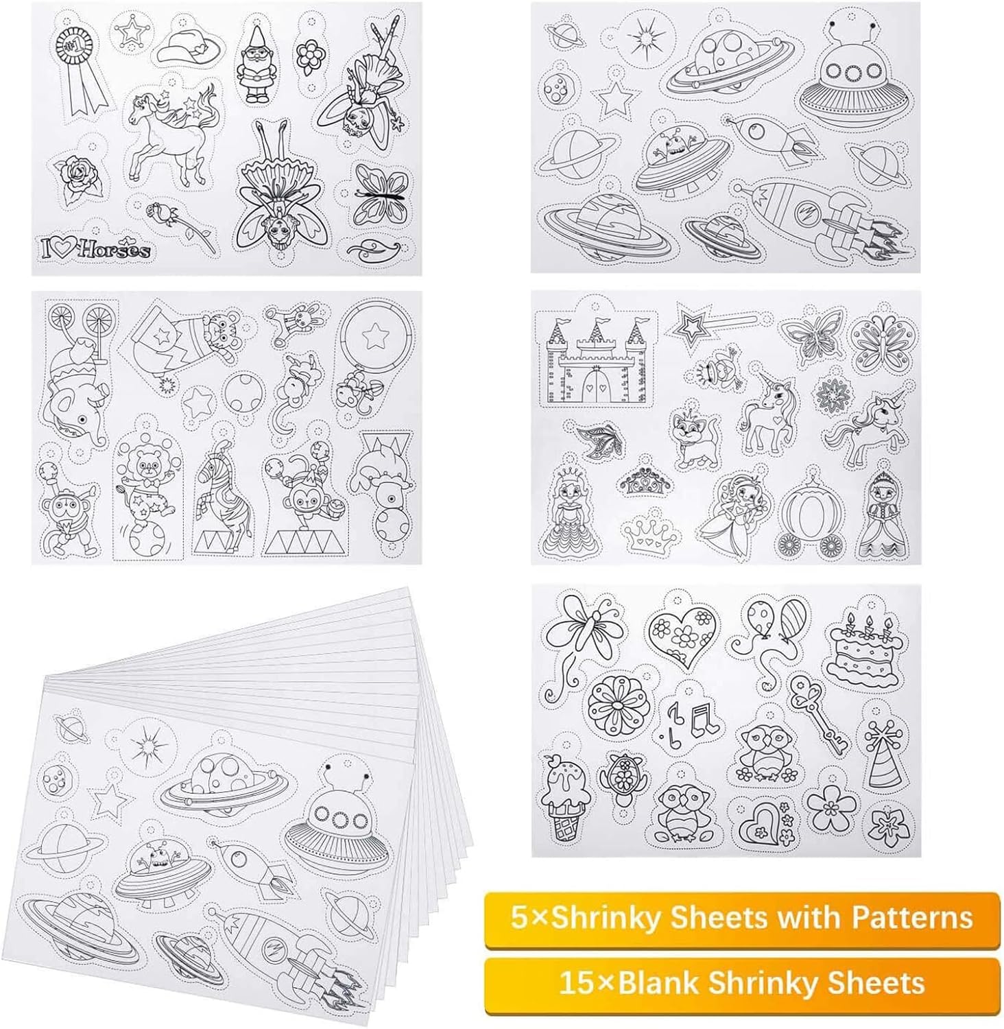 🦋【Fun Heat Shrink Art Paper】These shrinky sheets are made of high quality PVC and one side is frosted for easy to color. Shrinks to 20% of its original size after heating. There are 2 kinds of shrinky sheets in this package, blank and patterned. You can directly color the pattern, or create your own pattern on the blank sheets. Just draw and color your favorite art, cut it out with scissors and it will shrink in your oven.