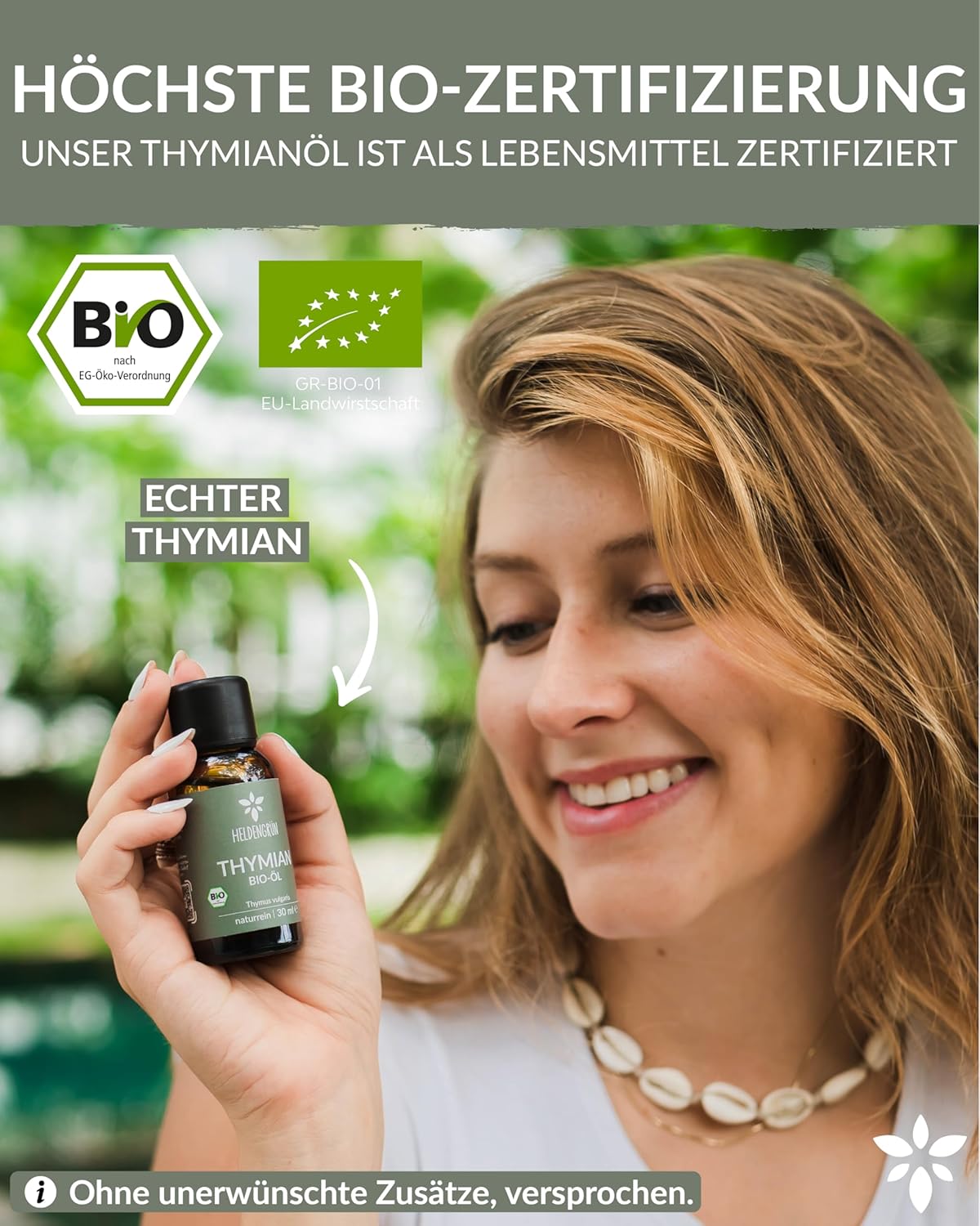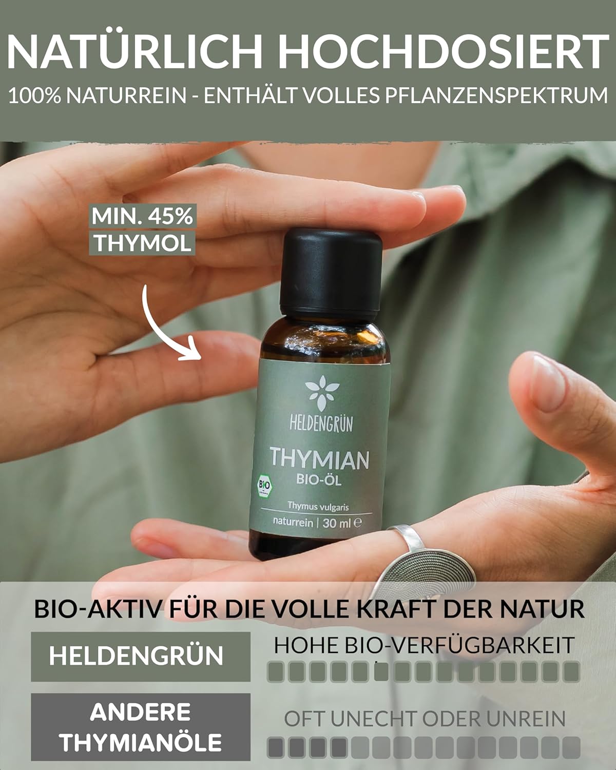 [Organic quality you taste] – Our Heldengrün organic thyme oil is certified by the independent eco-control body Ecocert and brings the spicy thyme aroma to your kitchen. Ideal for adding a Mediterranean touch to food and drinks.