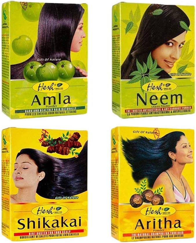 A complete natural hair treatment pack for women. Hesh amla powder Hesh aritha powder Hesh brahmi powder Hesh shikakai powder.