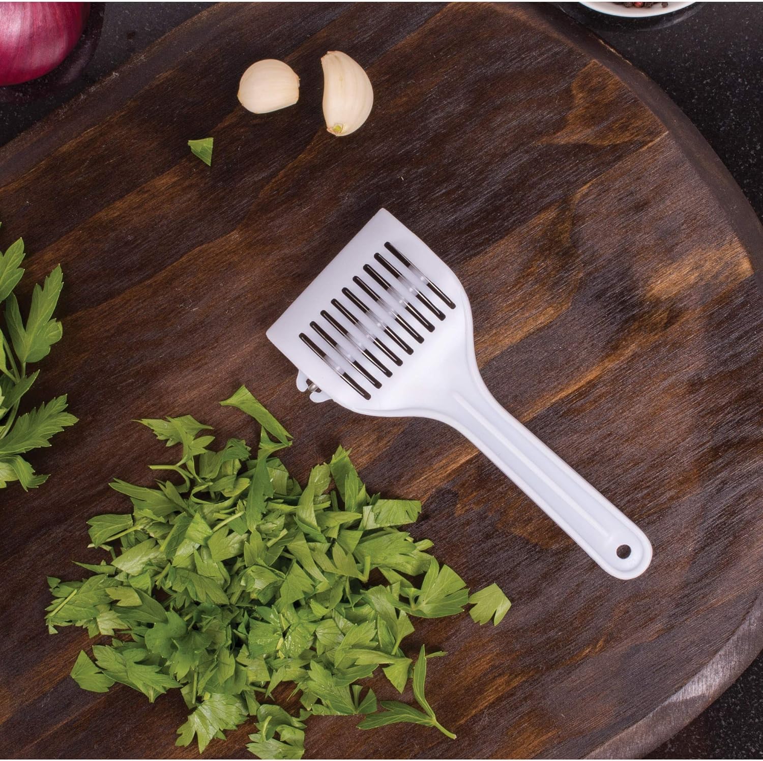HIC’s Gourmet Herb Mincer for mincing garlic and herbs, chopping greens and fruits, tenderizing meat, fish, and more, in just seconds