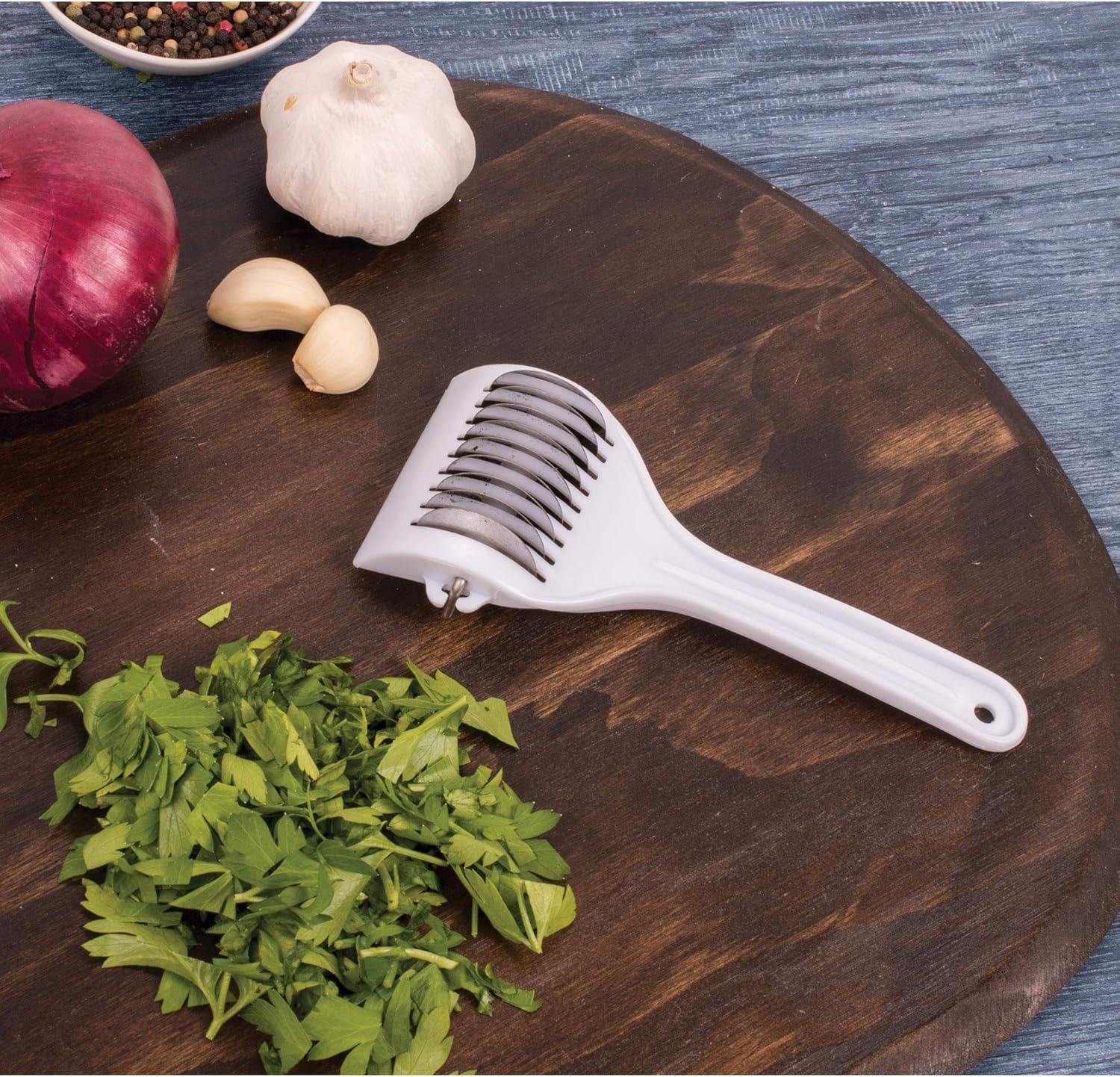 HIC’s Gourmet Mincer for chopping greens and fruits, mincing garlic and herbs, cutting noodles, tenderizing meat, fish, and more. With 9 stainless steel blades, it transforms ingredients in just seconds and saves time during food preparation. A versatile addition to cutlery and chef knives, this multipurpose herb mincer is great for preparing ingredients for all food choices, including low carb, paleo, gluten free, raw and vegetarian. Use it for making minced garlic and roughly chopped herbs for stir fry, vegetable soup, toppings for chopped salad, even tenderize meat and poultry more. Its easy-grip handle is comfortable to hold. So easy to use. Simply place items to be minced or tenderized onto a cutting board. Roll the blades across the items and continue until desired texture is achieved. The 9 blades are made from stainless steel. The easy-grip handle is durable and comfortable to hold. Dishwasher safe for easy cleanup.
