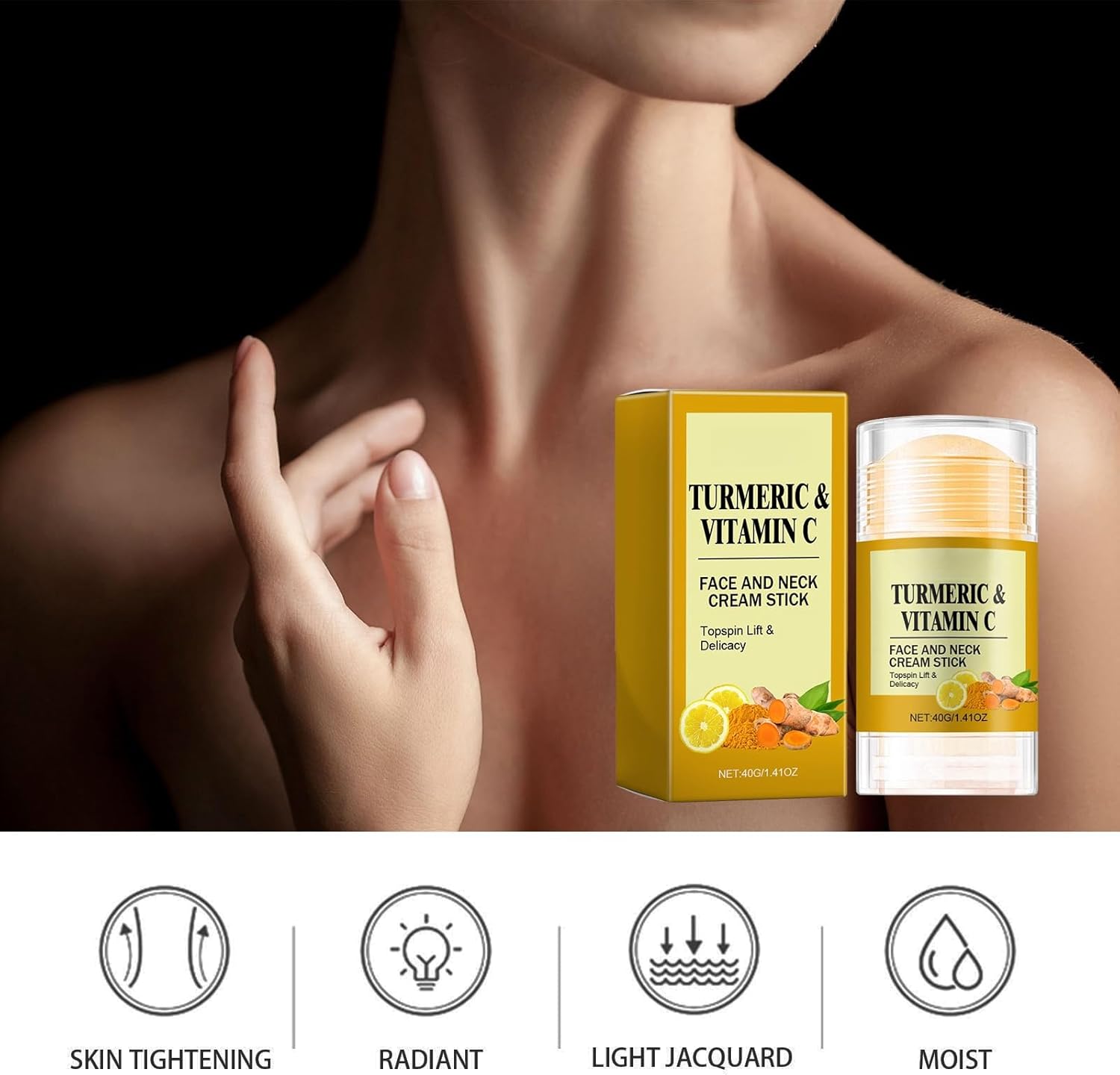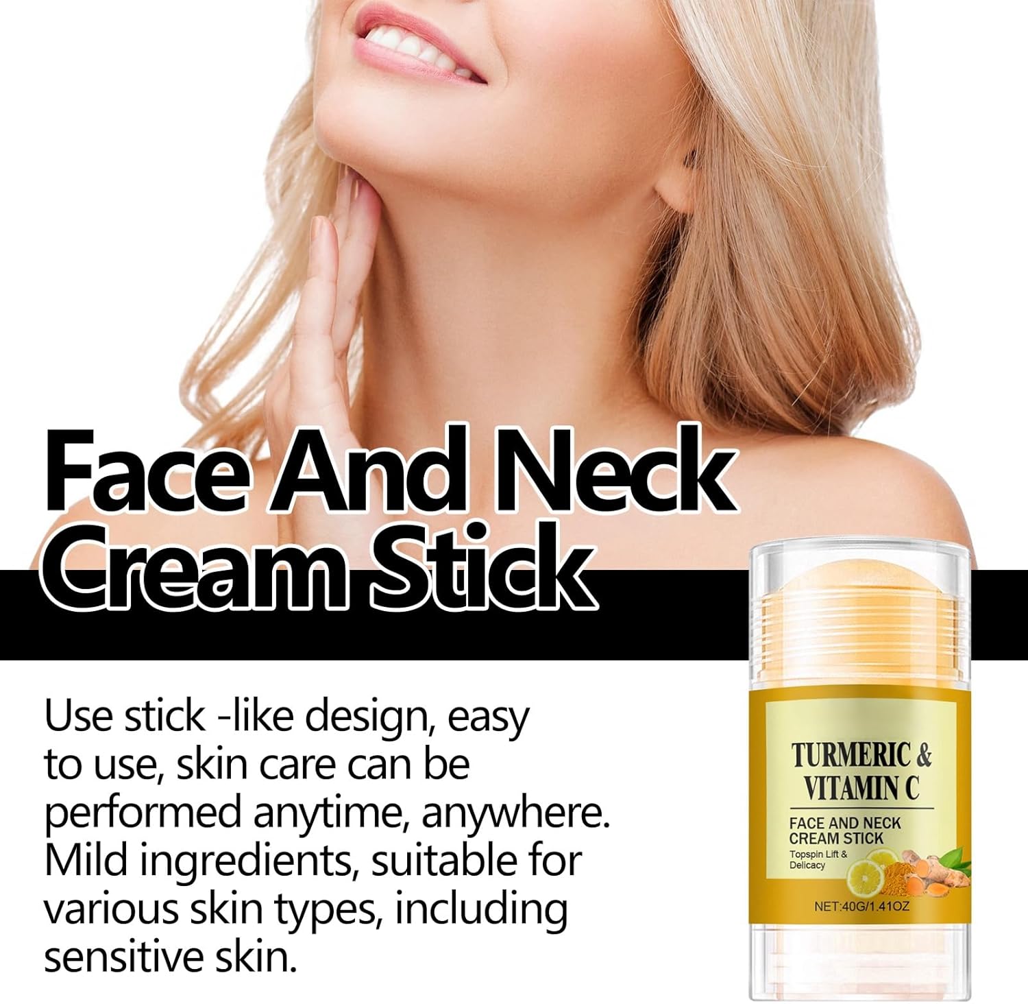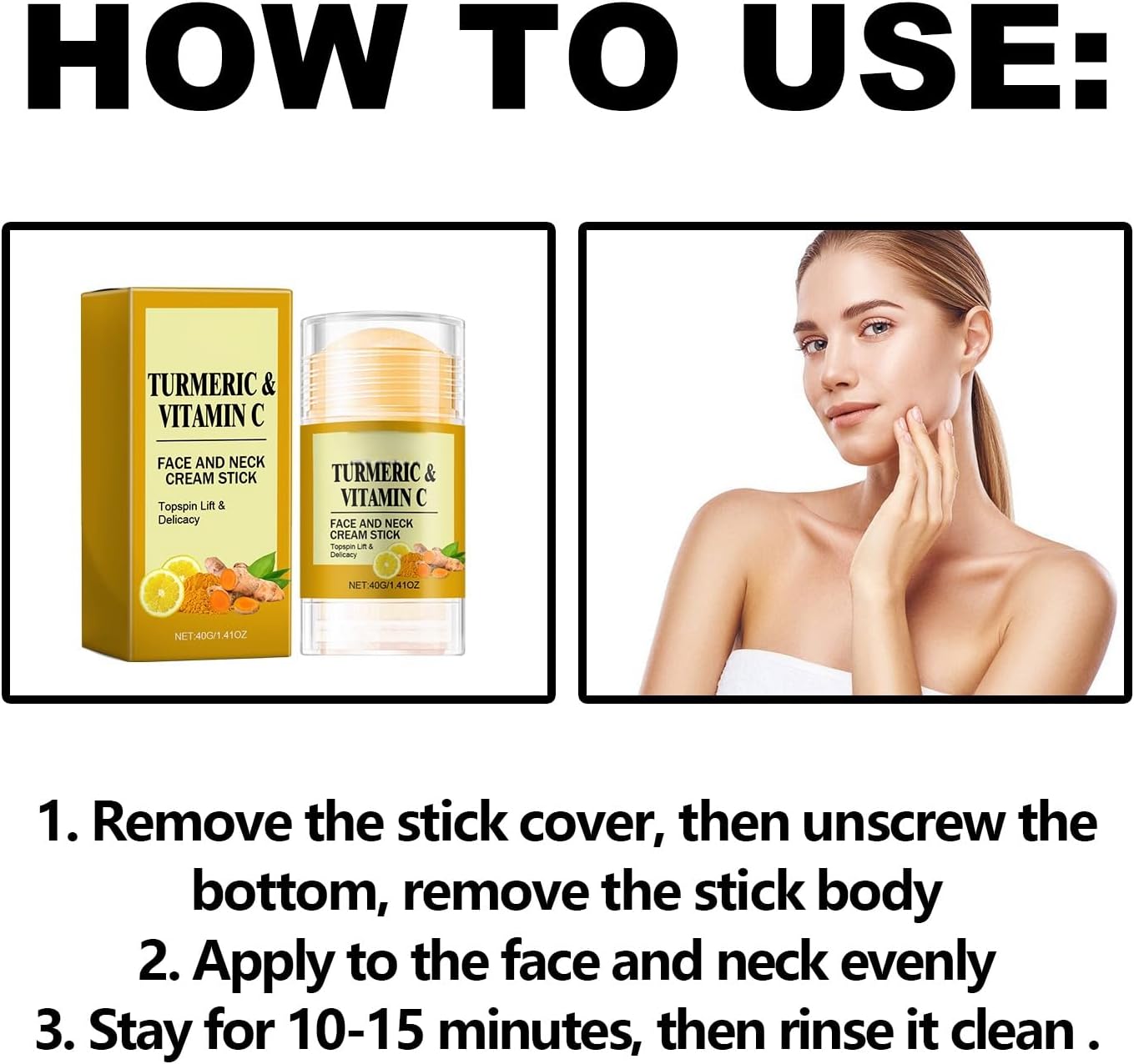 Apply the cream stick directly to cleanse face and neck using gentle upward strokes in the morning and evening for best results, gently pat skin until absorbed. Key ingredients include natural turmeric extract and vitamin C. Keep out of reach of children for external use only discontinue use if irritation occurs.