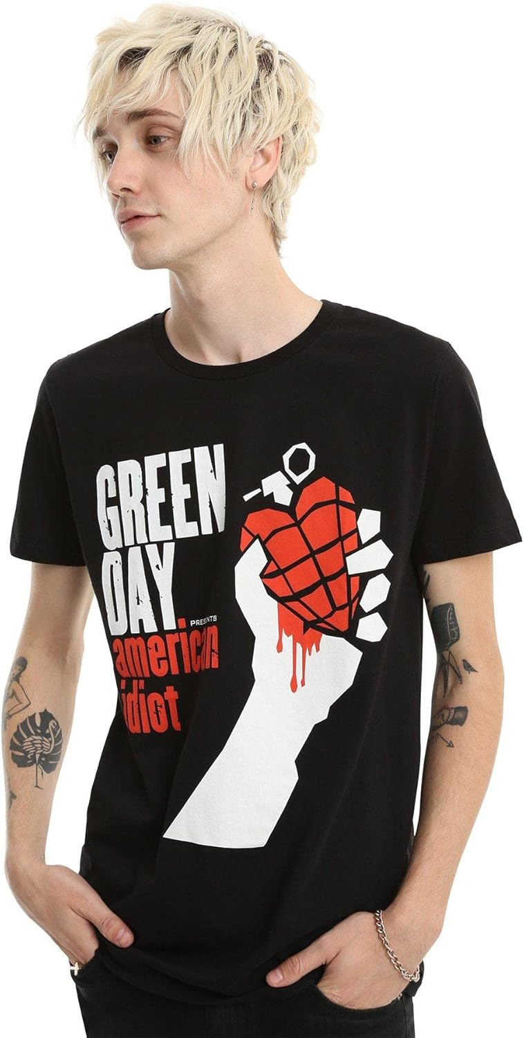 Rep your favorite pop punkers in this black T-shirt from Green Day. Front screen features an American Idiot cover art inspired design of a heart-shaped hand grenade gripped in a blood-soaked fist.
