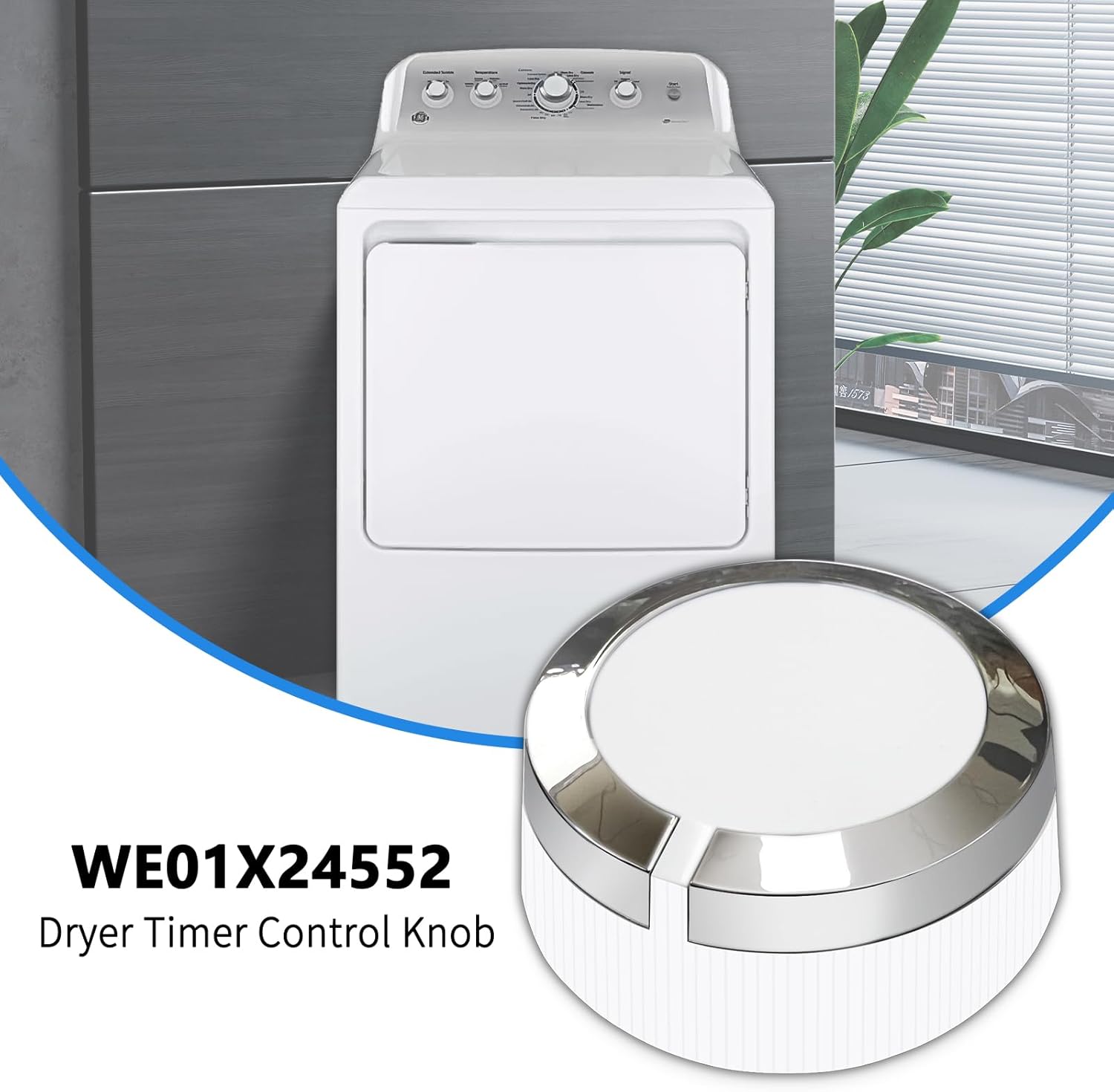 HPUY WE01X24552 timer control knob replacement for GE / General Electric dryer knob Replacement. Made of reinforced ABS with a clear pointer marking and strengthened inner D-shaft hub. Push-on installation—align the flat side and press into place.