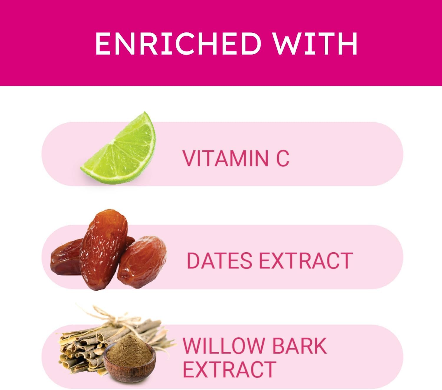 - Infused with vitamin C, date and willow bark extracts for hydrated and glowing skin