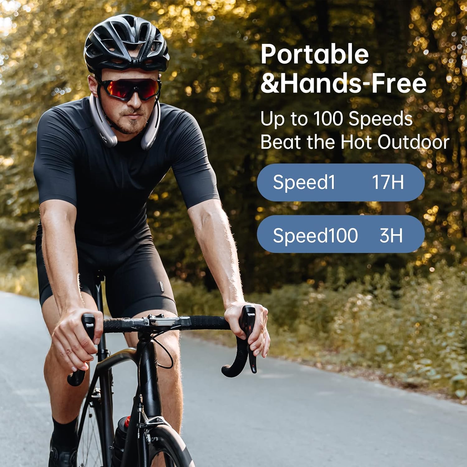 100 Speeds Wind: Twin turbo brushless motor brings strong wind power, neck fans for men can be adjusted at 1-100 speed by an infinitely adjustable knob, instant cooling, in any case, can provide the best cooling effect. In the hot summer, it is enough