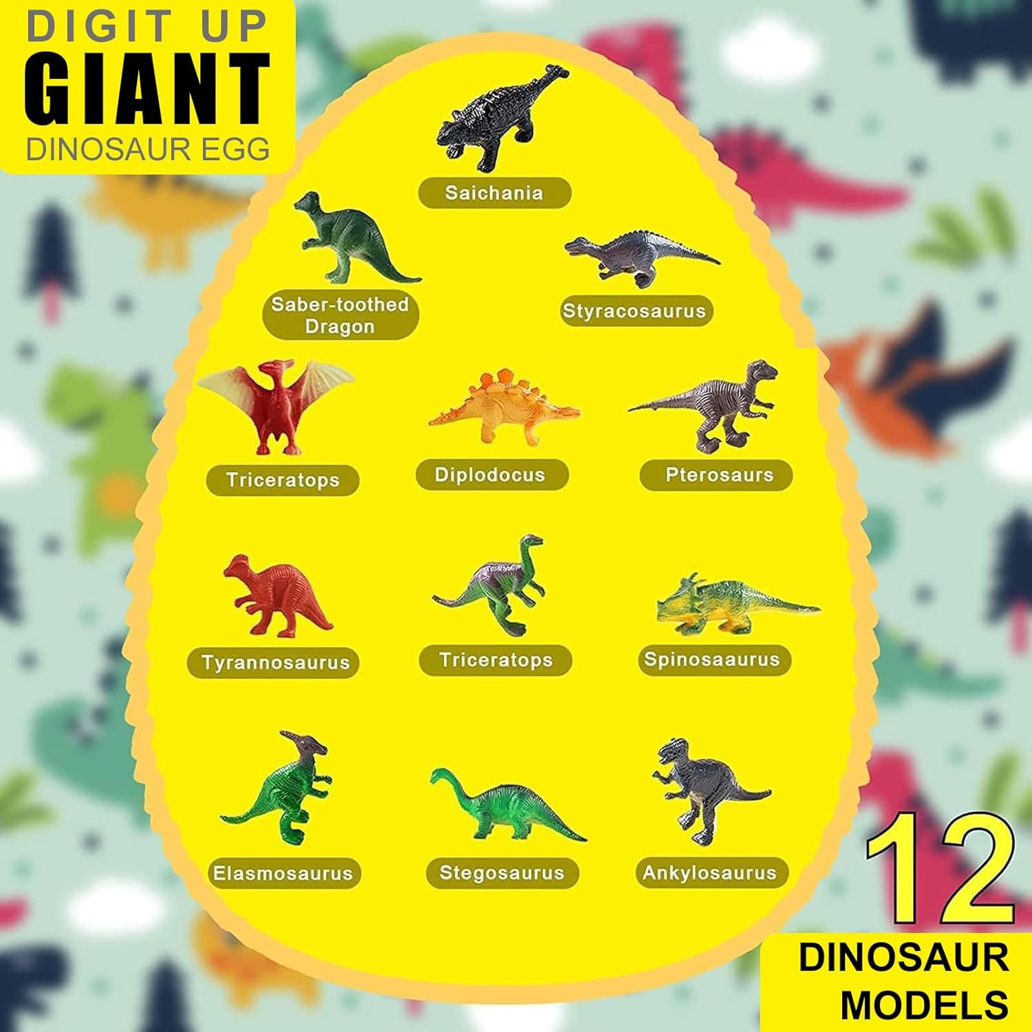 Jumbo Dino Egg Dig Kit, featuring Dinosaur Surprise Eggs with 12 Unique Large Dinosaur Toys. This set includes a Free Safe Digging Tool, designed as an Educational STEM Activity for both Boys and Girls.