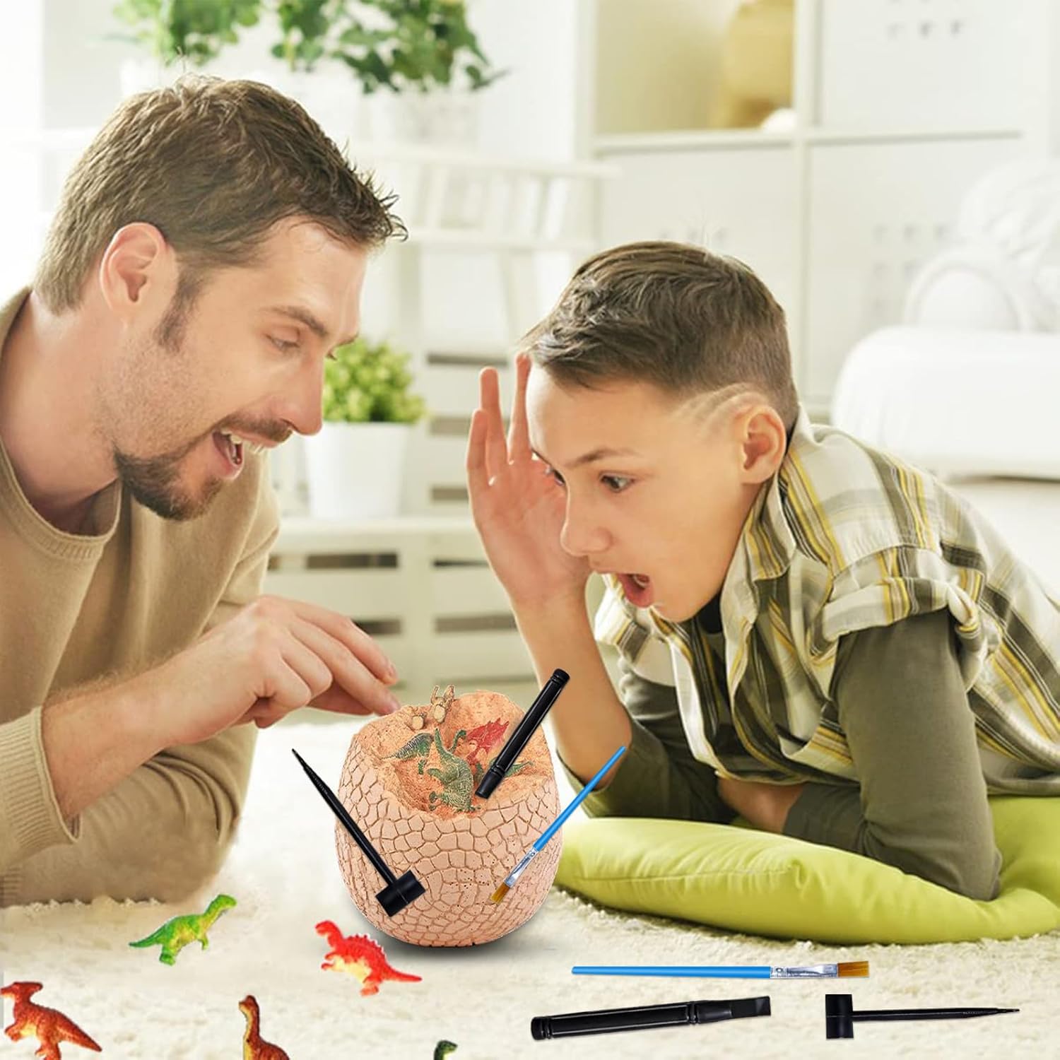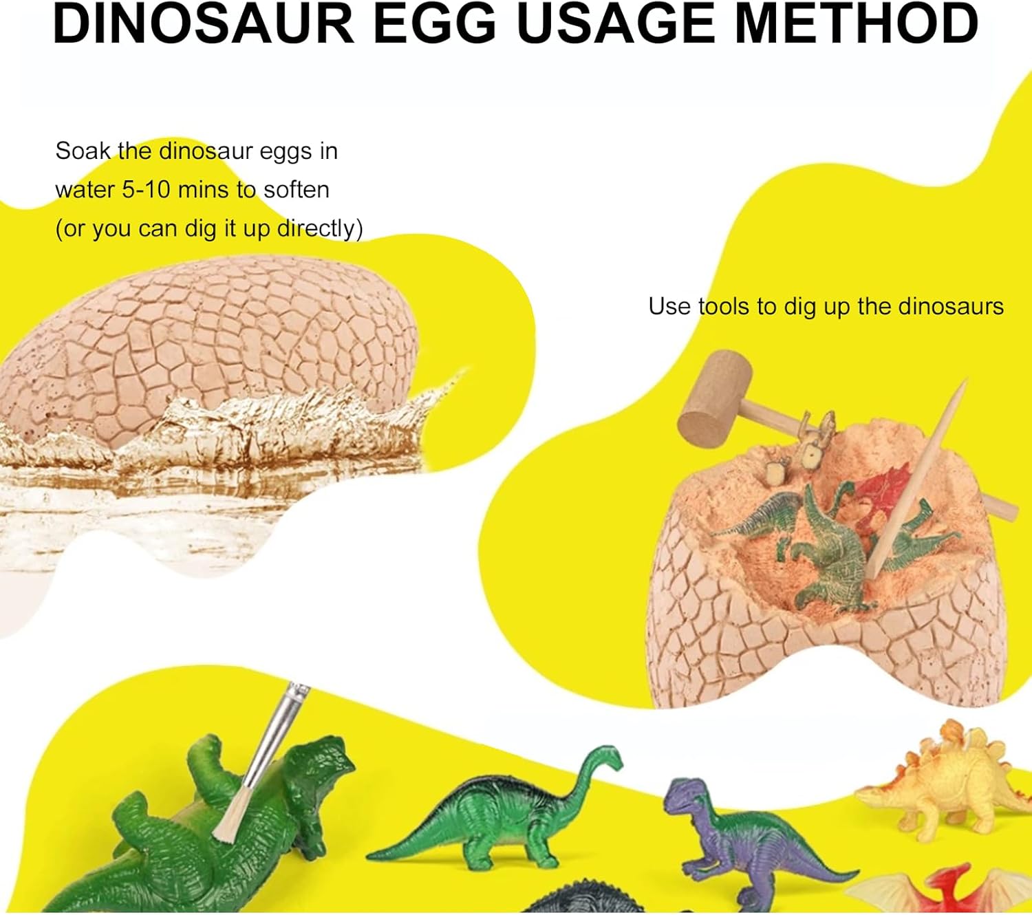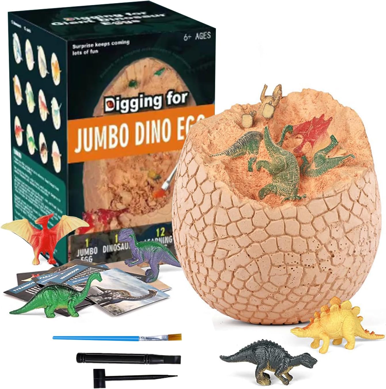 🦖 Mega Dino Egg Excavation Kit: Giant plaster egg with 12 premium dinosaur figures inside, Complete excavation toolkit: chisel, hammer & brush, T-Rex included! Plus other popular dinosaur species, Pro tip: Soak for 10 mins for easier digging