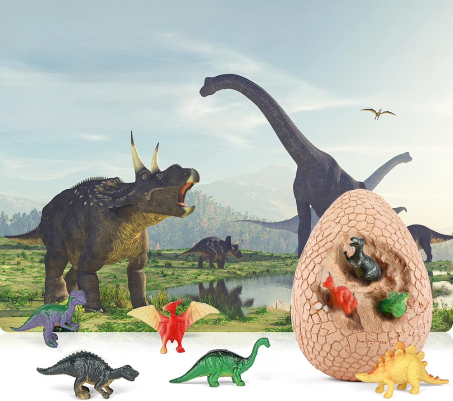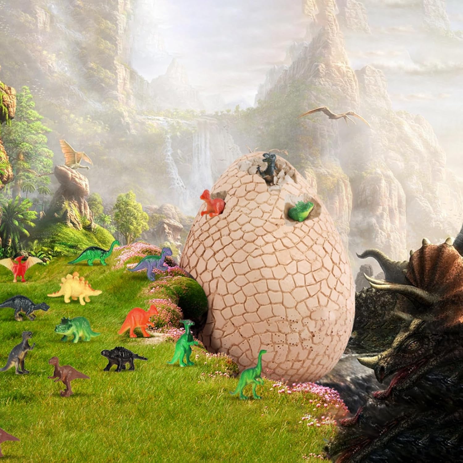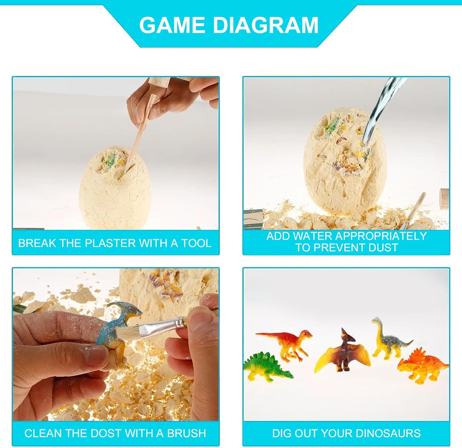 🦖 Mega Dino Egg Excavation Kit: Giant plaster egg with 12 premium dinosaur figures inside, Complete excavation toolkit: chisel, hammer & brush, T-Rex included! Plus other popular dinosaur species, Pro tip: Soak for 10 mins for easier digging