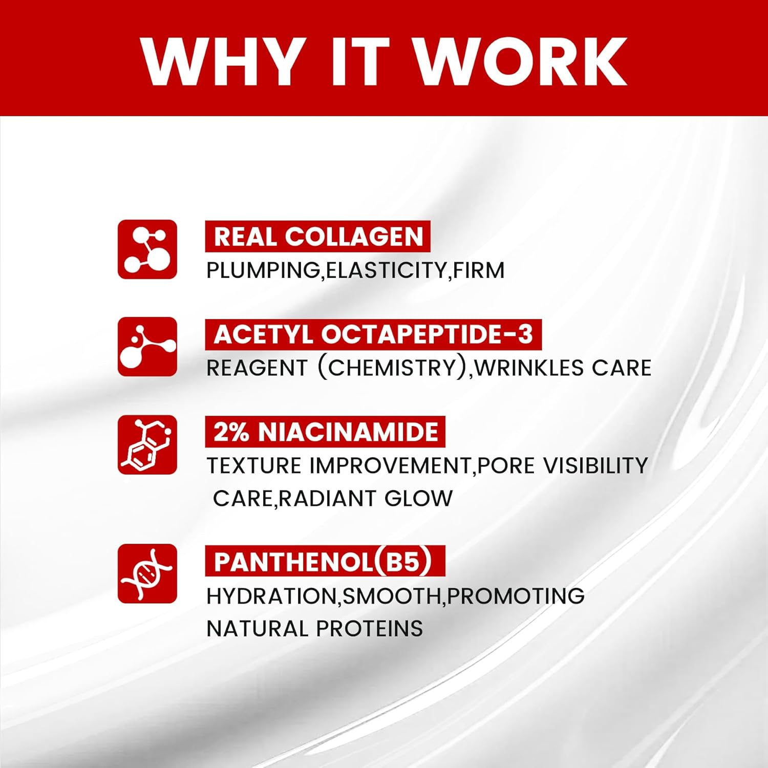 Powerful Ingredients:Real Collagen Extract for enhance skin elasticity and youthful radiance,Acetyl Octapeptide-3 for deep moisturizing and wrinkle care,and 2% Niacinamide for improves skin texture,pore visibility care,and reduces skin aging