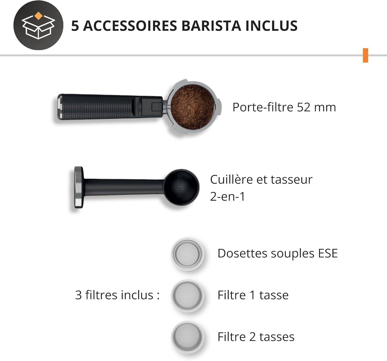 BARISTA ACCESSORIES: Everything you need for perfect espressos and delicious milk and coffee drinks, with a measuring spoon and coffee tamper, 3 reusable filters: one filter one cup, a two-cup filter and a soft pod filter (ESE)