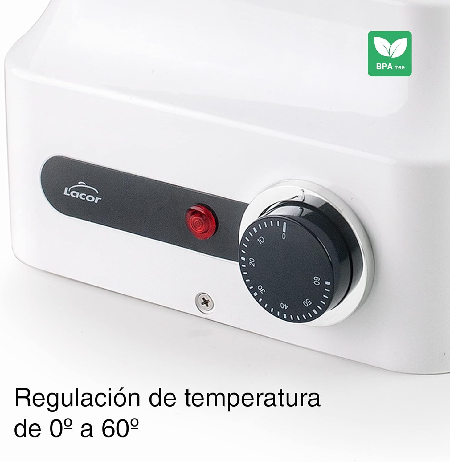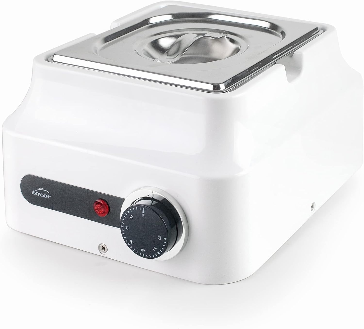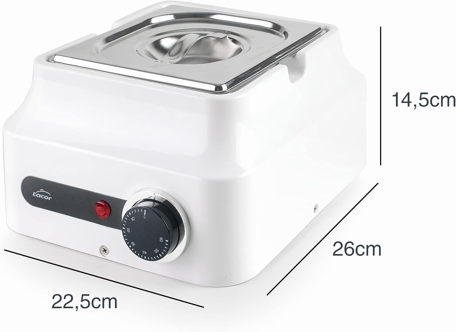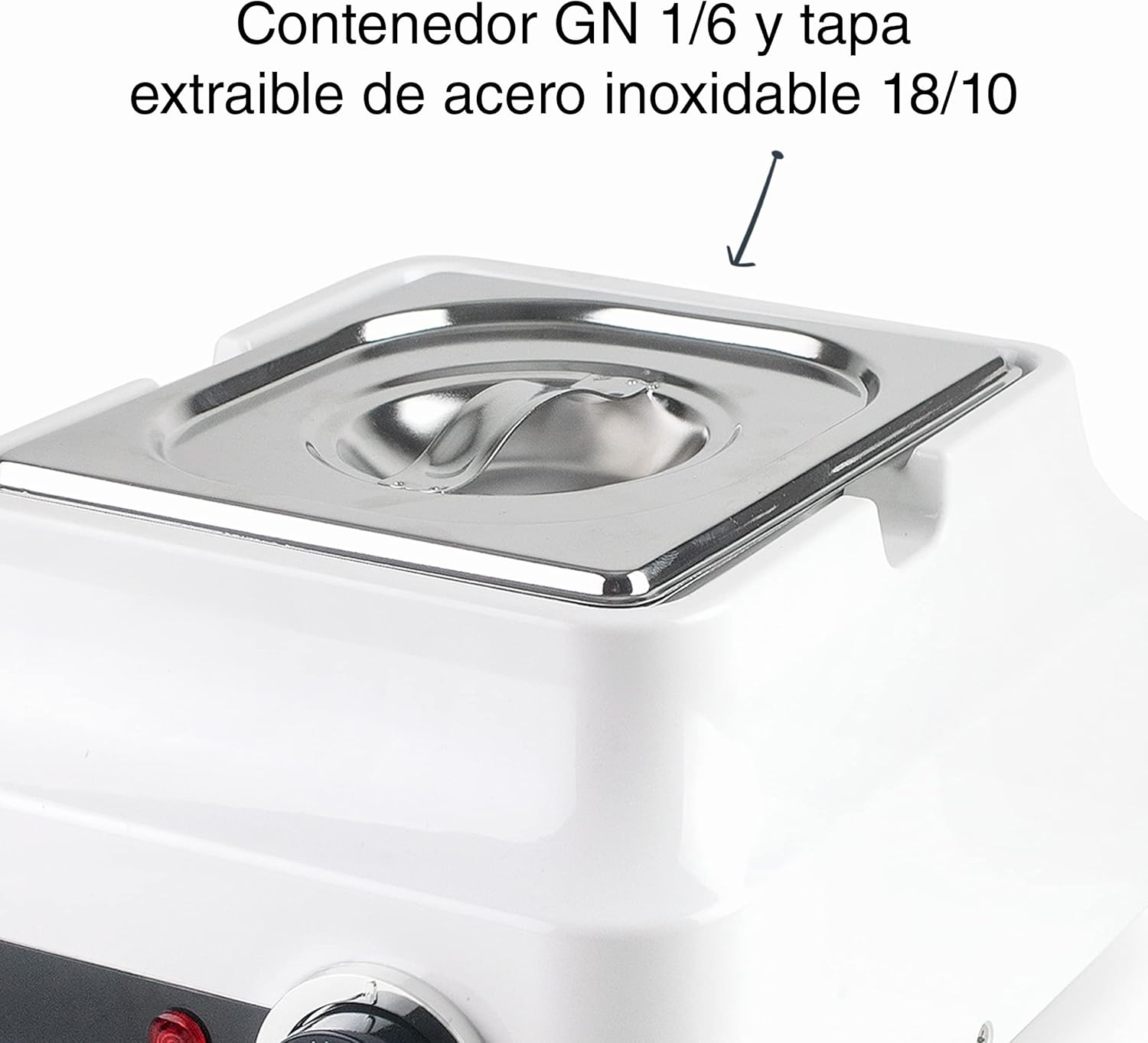 The Marie CHOCOLATE bath from Lacor is perfect for making high quality coverages and keeping them at the desired temperature for hours. Ideal for obtaining a glossy icing for cakes, cakes, cake pops, muffins, etc. Features a GN 1/6 container (1.50L) and removable lid made of 18/10 stainless steel to ensure quick and effective cleaning (both dishwasher safe). Temperature regulation by thermostat from 0ºC to 60ºC. 3D heating; heat is evenly distributed over the entire surface of the container, obtaining a more uniform result than with a localized heat source. Features an indicator light that turns on as soon as the desired temperature is reached. The bath Maria is compatible with buckets GN 1/6 of Lacor (ref. 66610 and 66610Z). The stockings and weight of the item are 22.5 x 26 x 14.5 cm and 1.25 kg.