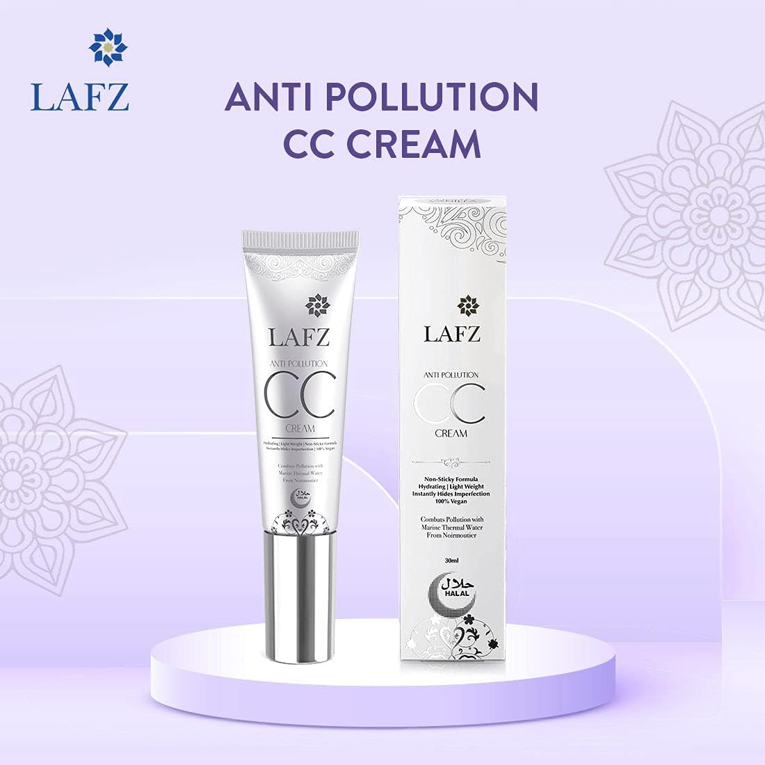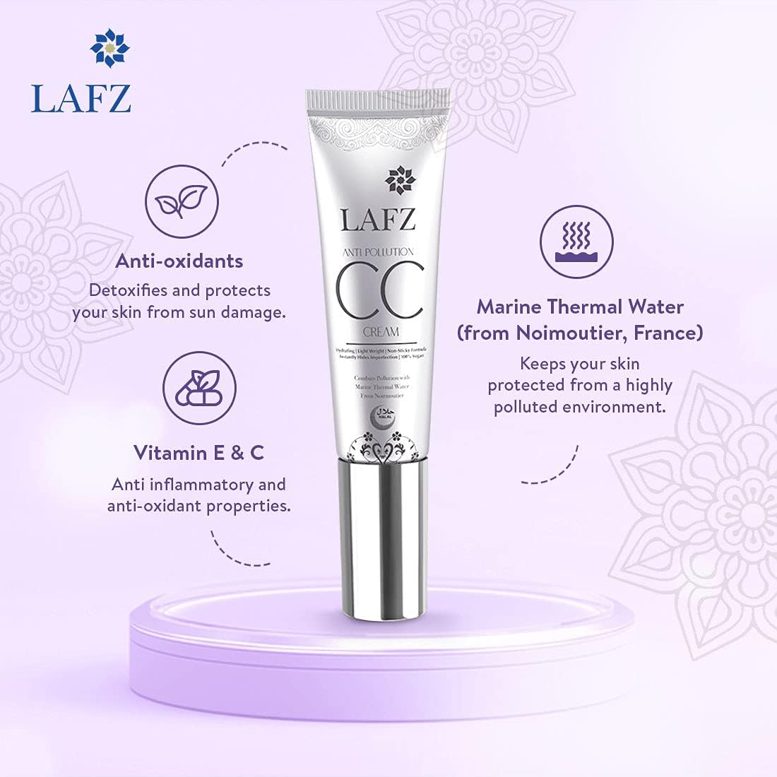 Lafz Anti-Pollution Cc Cream. Conceals Dark Spots And Blemishes Non-Sticky Formula For Long-Lasting Radiant Finish. Marine Thermal Water From Noirmoutier, France. Made In Italy.