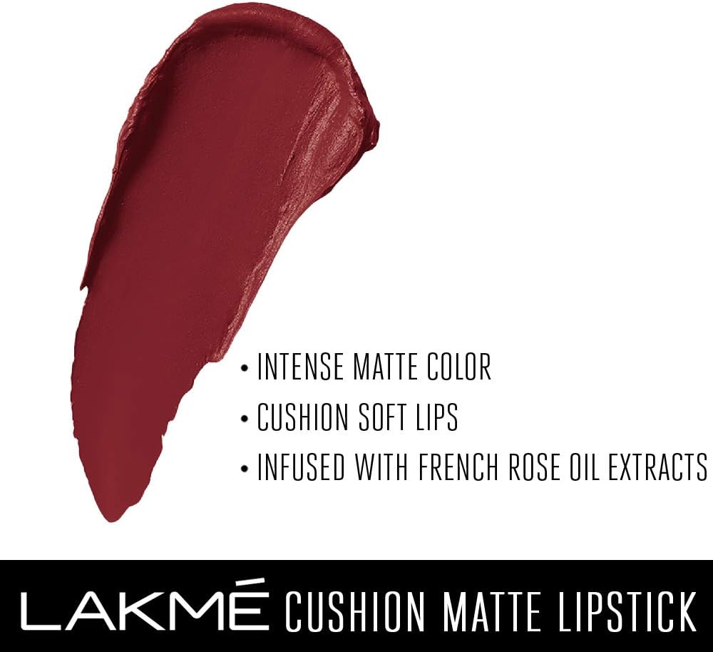 Presenting the new Lakmé Cushion Matte Lipstick. An exclusive new matte lipstick with a revolutionary soft matte formula that makes matte lips feel soft and comfortable. Why should you use Lakmé Cushion Matte Lipstick? This soft matte lip colour has an intense colour payoff that gives lips a matte yet soft focus effect. The soft matte formula is enriched with rose oil extracts from France which give your matte lips a moisturized, comfortable feel. Its non-drying formula doesn’t dry your lips and leaves them feeling soft and looking intensely matte. Lakmé Cushion Matte Lipstick cushions your lips in a single stroke with its smooth and creamy application. To get an even and uniform matte finish on your lips, start by defining your cupid’s bow, then smoothly glide the lipstick to the other edge of both your upper and lower lips. Lakmé Cushion Matte Lipstick is a water-resistant soft matte lipstick that gives you a long lasting intense matte lip colour and cushion soft lips all day. How can you complete you makeup look with this Lakme Nude Lipstick? Choose from 20 vibrant matte lip colour shades and wear cushiony soft lips for a variety of occasions. To complete your soft matte look, pair your Lakme cushion matte lipstick with Lakmé Eyeconic Lash Curling Mascara, and Lakmé Impact Eyeliner. Try it now!