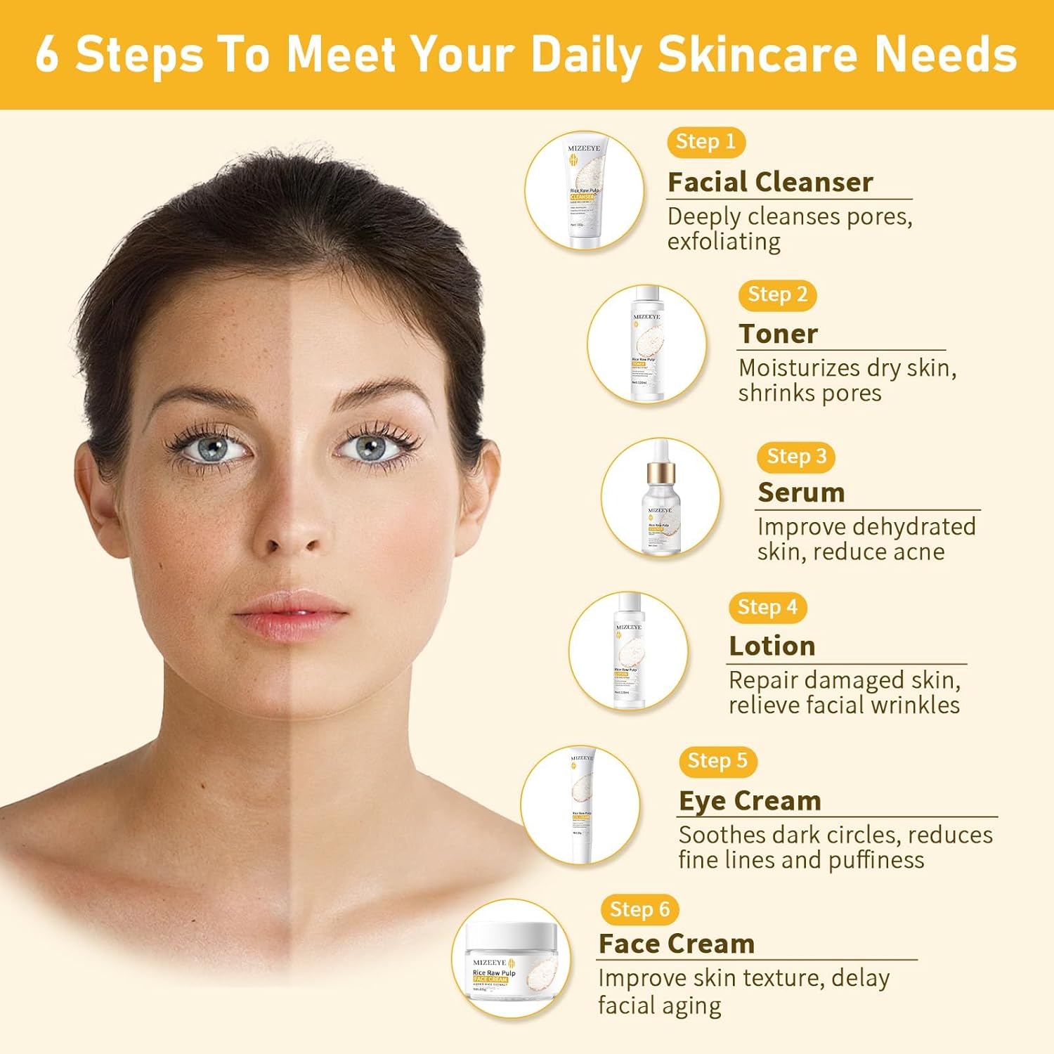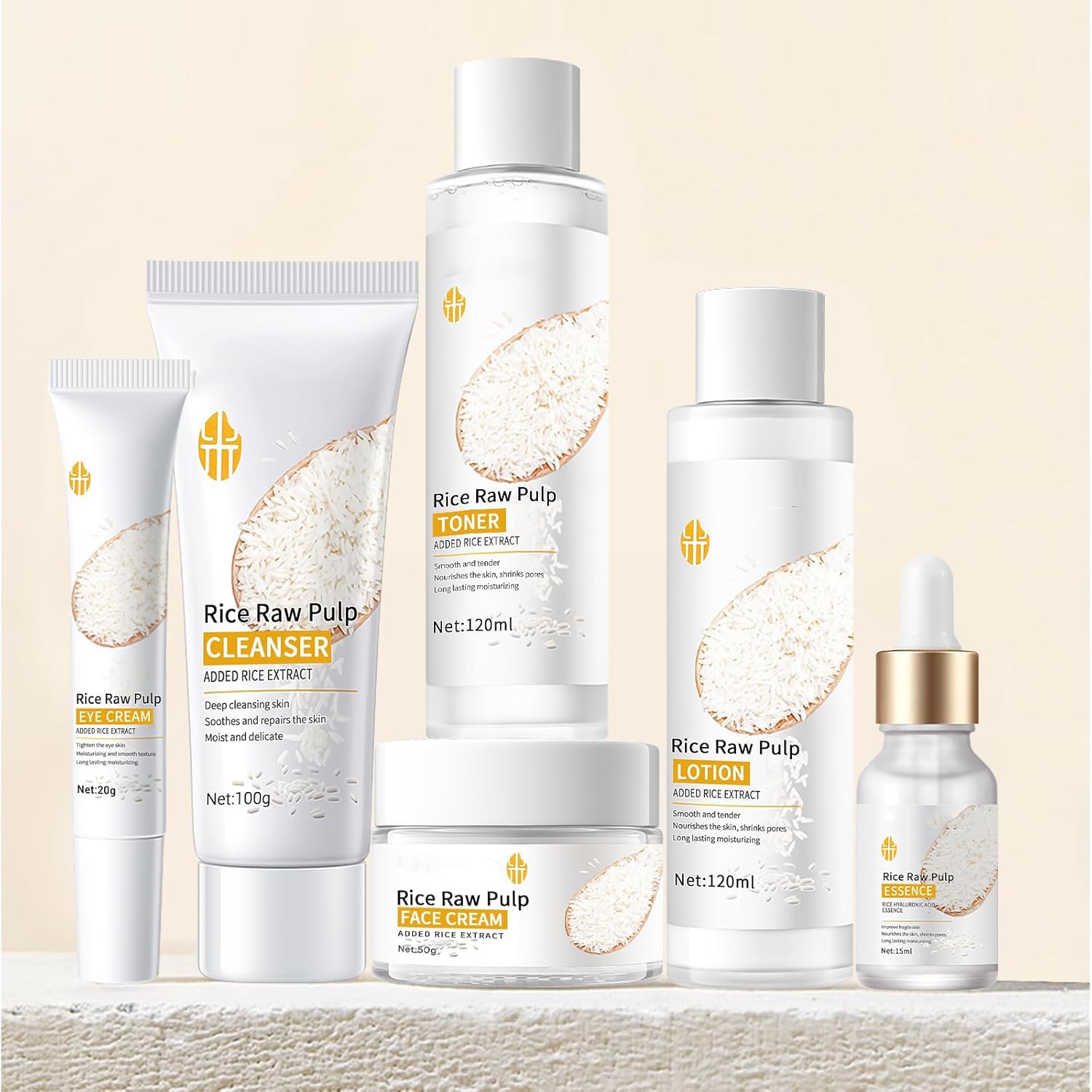 【Rice Skincare Routine Set】: The rice raw pulp skincare set contains rice essence, including facial cleanser, toner, lotion, essence, eye cream and face cream. Fully meet daily skin care and travel skincare needs, deeply nourishing the skin