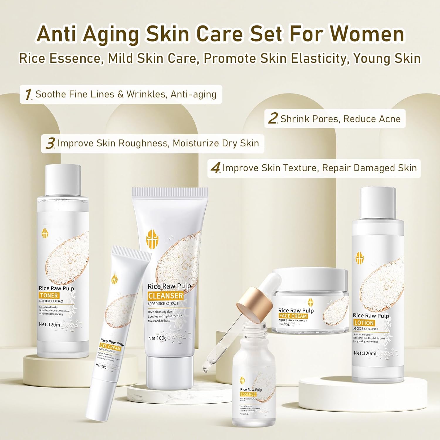 【Anti-Ageing Skincare Set】: The rice essence contains rich nutrients, which can repair damaged skin, relieve facial fine lines and wrinkles, improve skin texture, delay skin ageing and restore skin elasticity