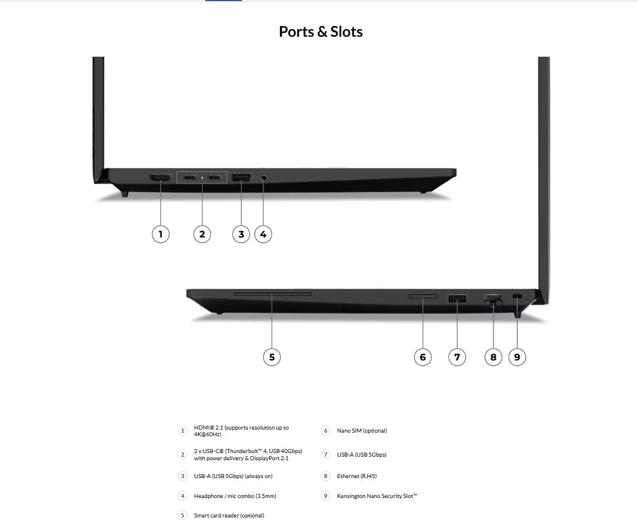 Superior connectivity with WiFi capabilities and WWAN technology to stay online 24/7. Includes: 1x USB-A (USB 5Gbps / USB 3.2 Gen 1); 1x USB-A (USB 5Gbps / USB 3.2 Gen 1), Always On; 2x USB-C (Thunderbolt 4 / USB4 40Gbps), with USB PD 3.0 and DisplayPort 2.1; 1x HDMI 2.1, up to 4K/60Hz; 1x Headphone / microphone combo jack (3.5mm); 1x Ethernet (RJ-45); and 1x Security keyhole.
