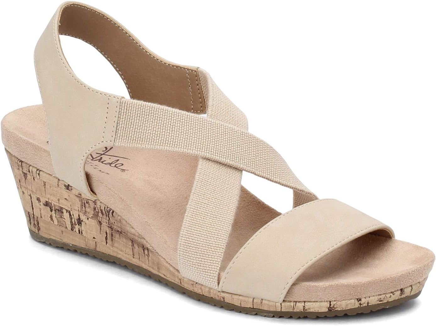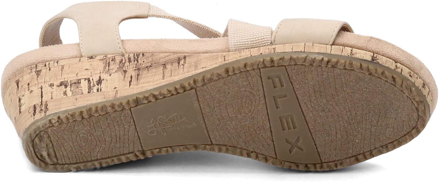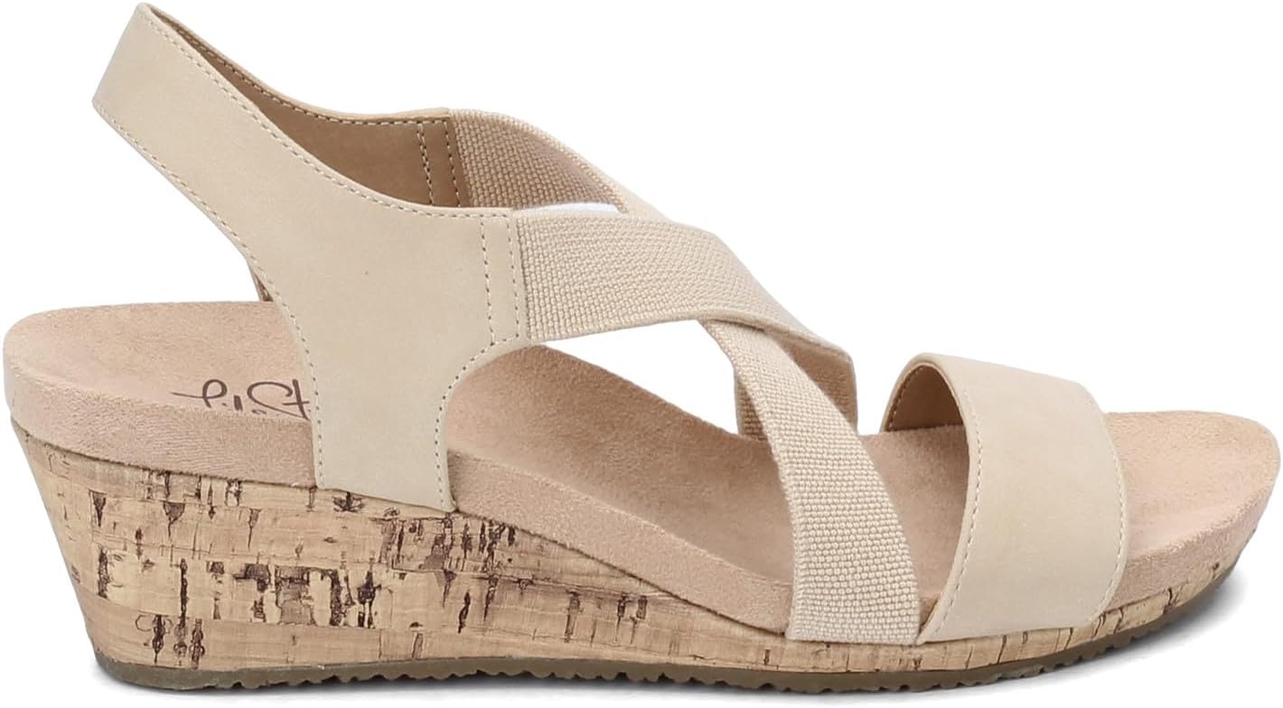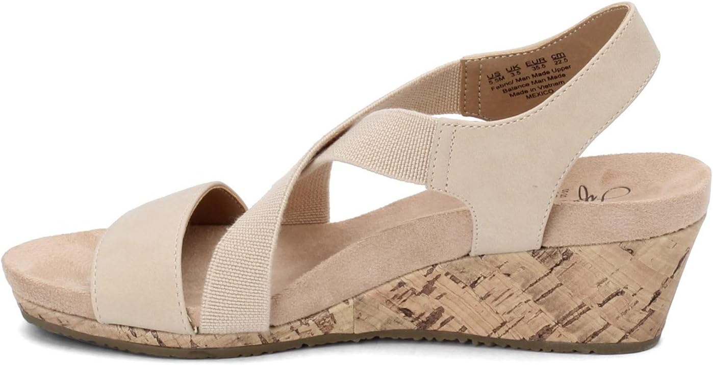 Make every step memorable with the mexico wedge sandal from LifeStride. Faux leather upper with an open toe, crisscrossing fabric strap accent, heel sling strap, and cork-wrapped wedge. Soft system® comfort package provides all-day support, flex, and cushioning traction sole provides you with extra stability just right height 2 inch wedge heel.