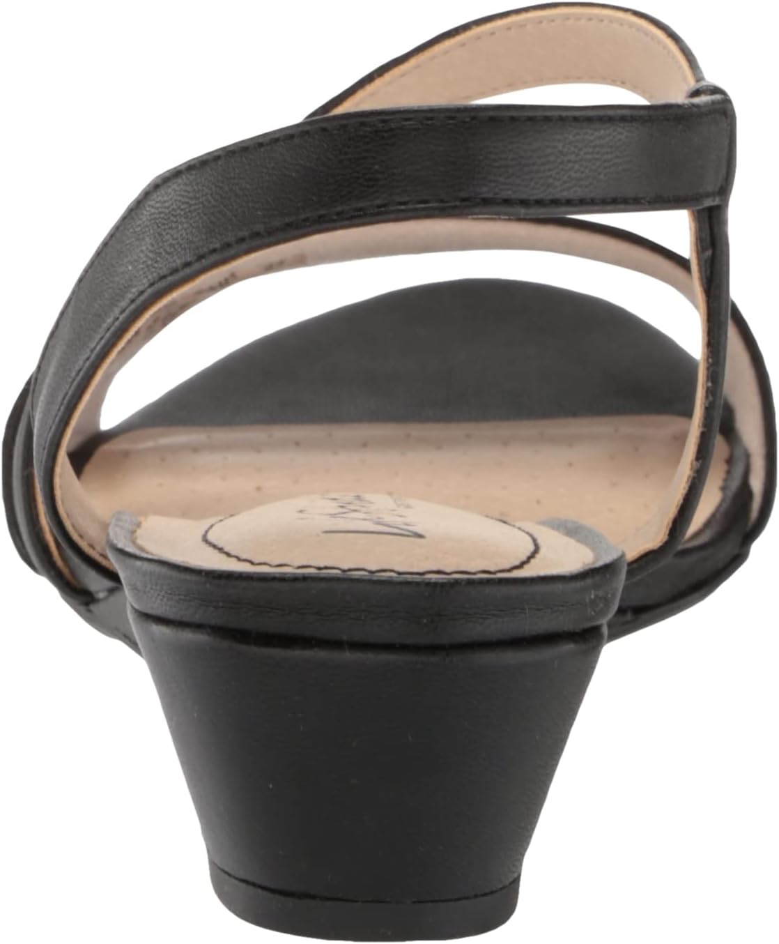 Añade un toque elegante a cualquier look con esta sandalia de cuña fácil de usar con una correa asimétrica. Parte superior de piel sintética, tela o lona con puntera abierta, ajuste sin cordones, detalle de correa asimétrica y cuña envuelta.