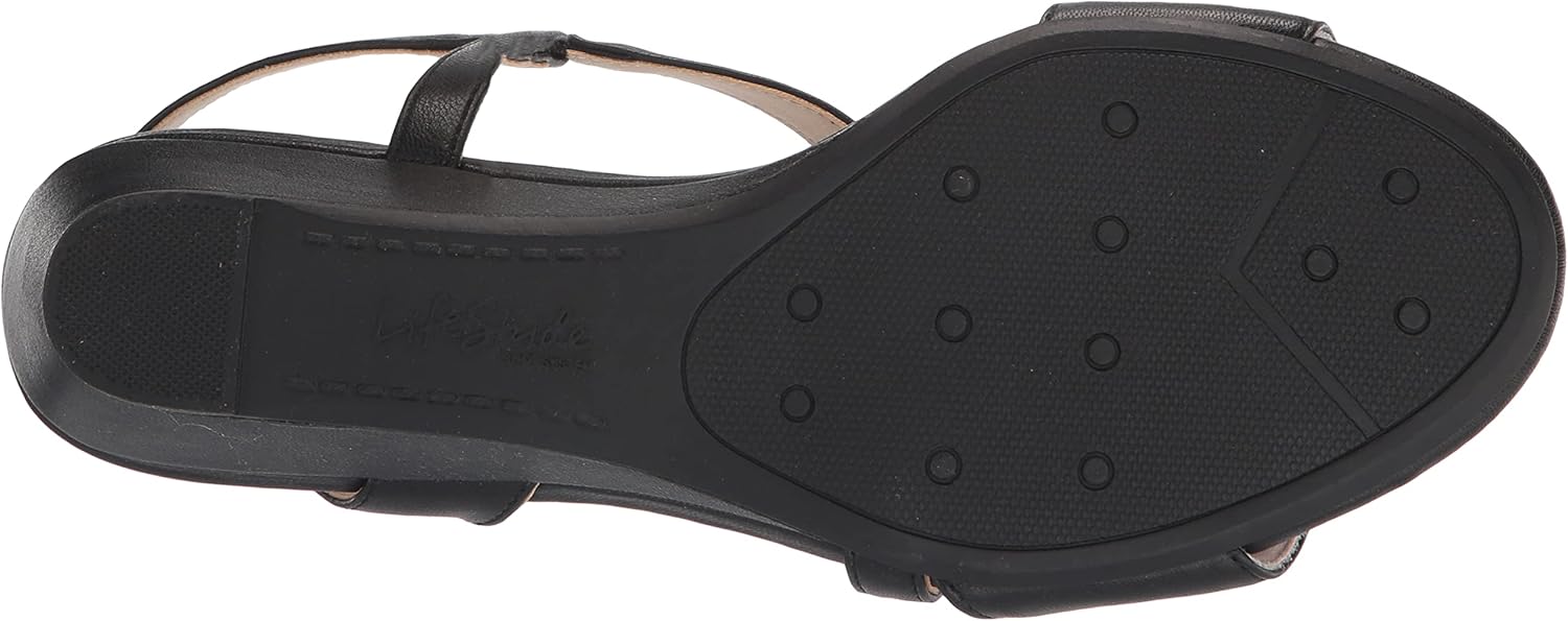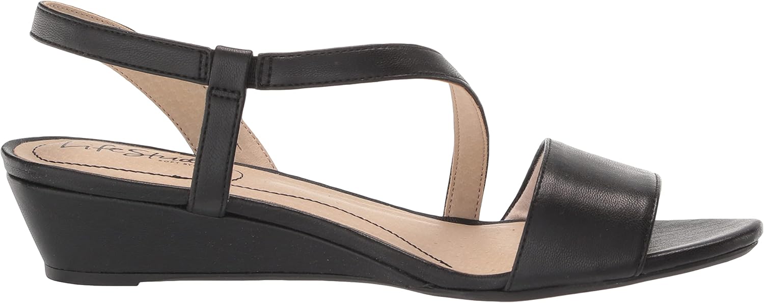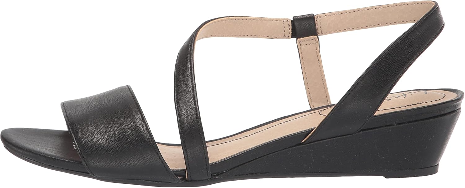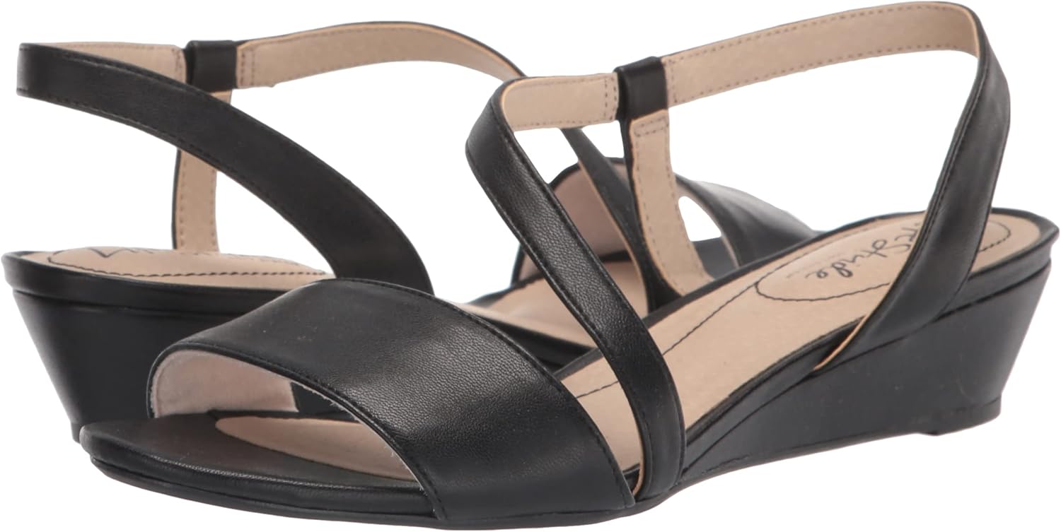 Add a stylish touch to any look in this easy-to-wear wedge sandal with an asymmetrical strap. Faux leather, fabric, or canvas upper with an open toe, slip-on fit, asymmetrical strap detail, and wrapped wedge.