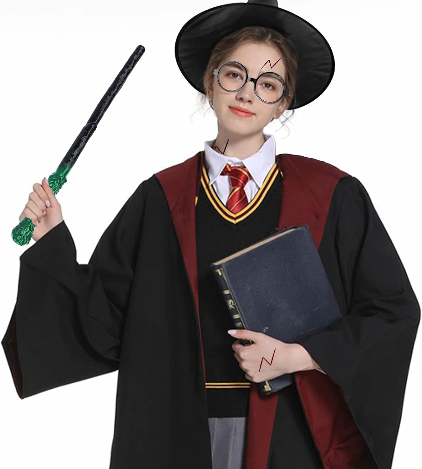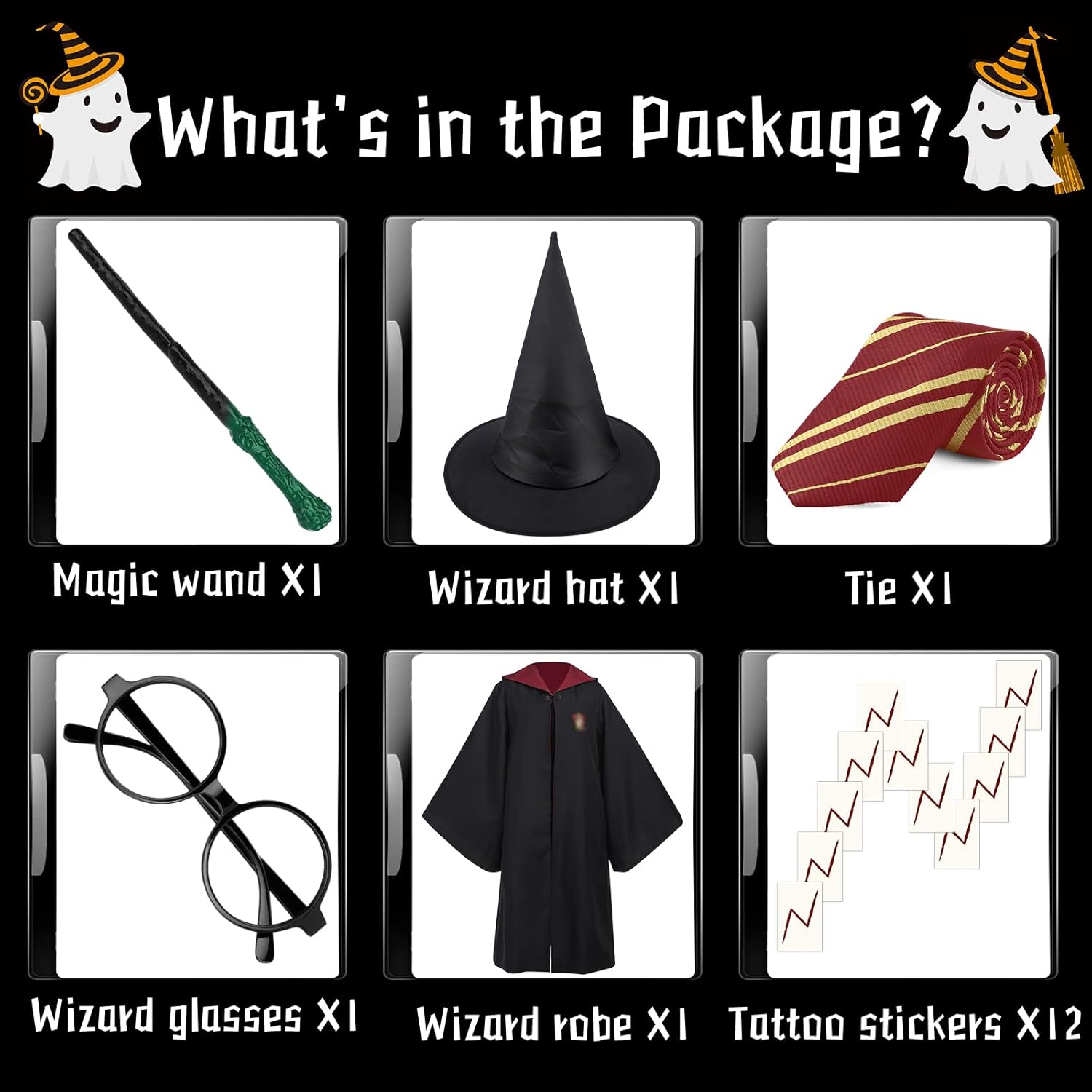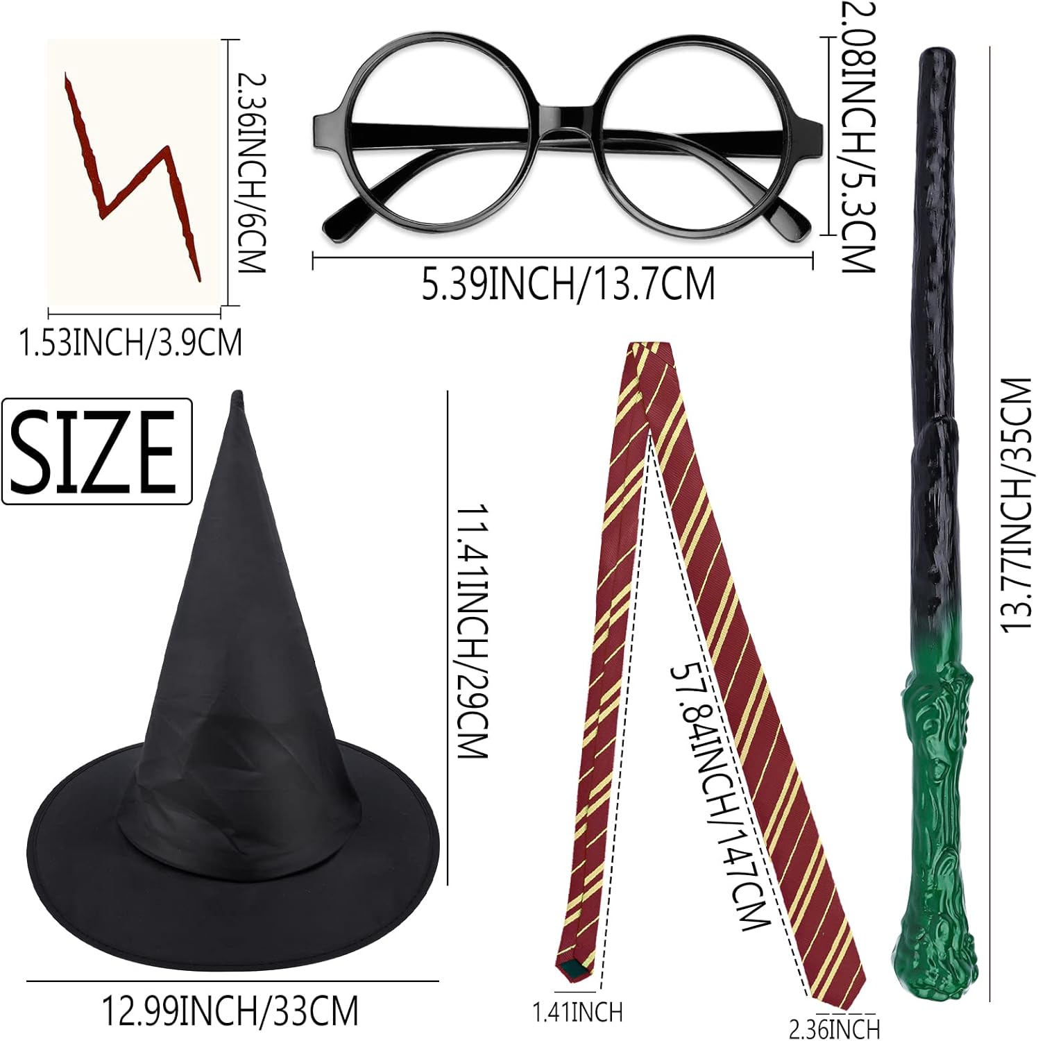 Magic Wizard Unisex Costume Robe Cape with Magic Wand Tie Magic Hat Glasses Frame Tattoo for Adults Kids Cosplay Dress Up Costume Accessories