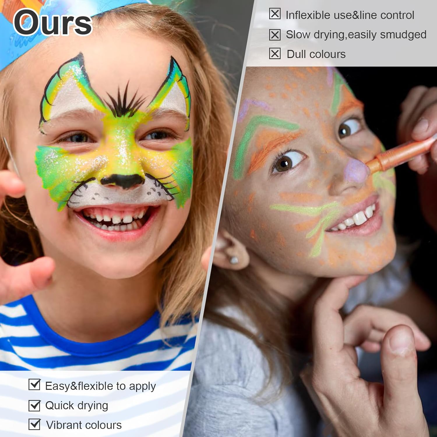 FUN AND PRACTICAL GIFT—These acrylic colouring pens with ergonomic pen body are easy to apply for kids and adults, suitable for birthday parties, fancy dress, masquerade, group games and activities, costume parties, Halloween make-up and so on. Ideal as a gift for your kids, friends, and family or as a party favor.