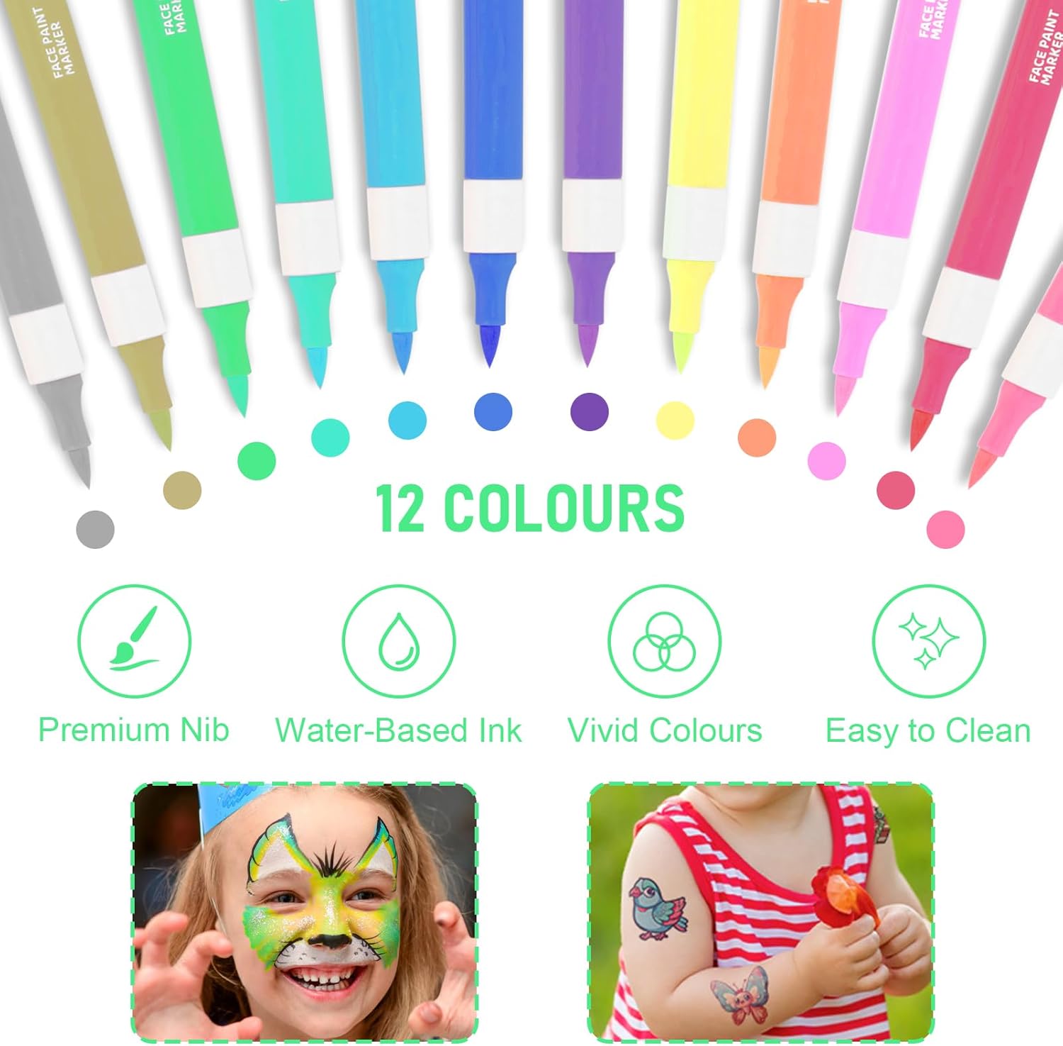 12 VIBRANT COLOURS: This acrylic paint pen set uses high-quality vibrant inks with great coverage, fast drying within seconds and fade resistant so the patterns can stay vivid and intact for an extended time, perfect for creating unique eye-catching designs on face, nails and body.