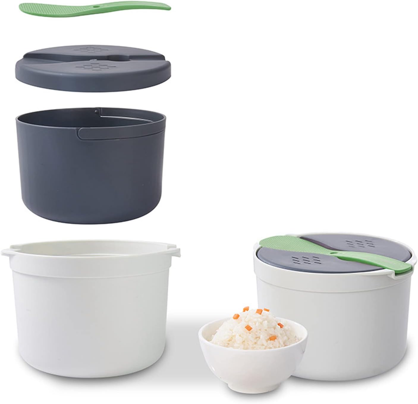 Packing: The microwave rice cooker set includes a rice scoop, lid, strainer and steaming pot for all sizes of microwaves.