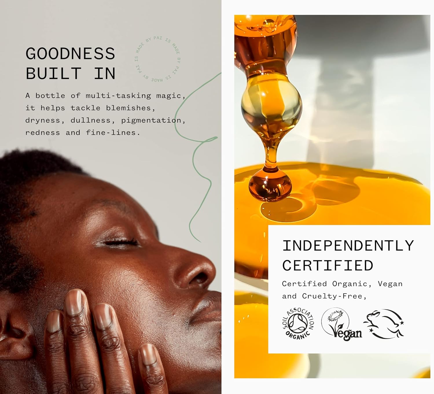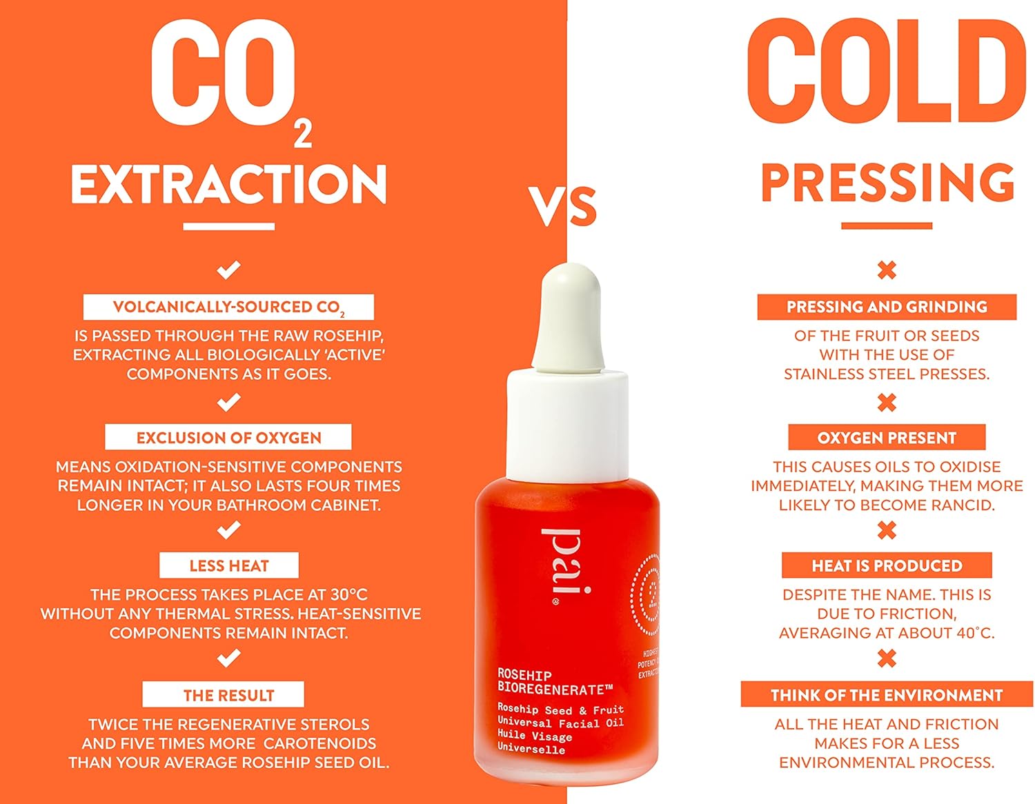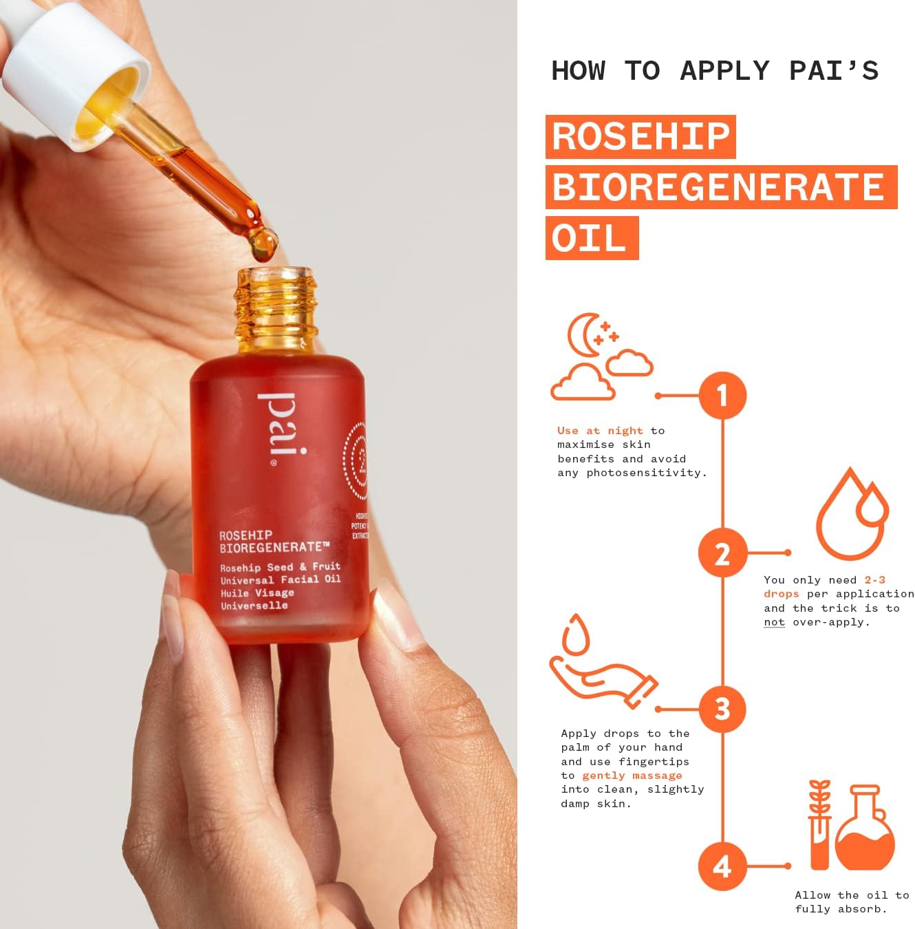Pai Rosehip BioRegenerate Oil is rich in concentrated Omega 3 & 6 – essential fuels for the skin’s natural repair function. With regular use, it conditions the skin, improving skin firmness and elasticity.Clinical studies show Rosehip is effective at improving the appearance of scars, stretch marks, sun damage and fine lines.Highest Potency Rosehip Rosehip BioRegenerate is unique in containing concentrated fruit hip oil, with double the regenerative sterols and five times the carotenoids of seed oil.Premium CO2 supercritical extraction delivers the complete and concentrated properties of the plant.This makes Pai Rosehip BioRegenerate far more powerful than simple cold pressed Rosehip seed oils.Pai’s premium Rosehip oil is like no Rosehip you have tried before… * Unique in containing concentrated “fruit” oil with twice the regenerative sterols and five times the carotenoids of the more commonly used seed oil.* Deep orange color (that’s the carotenoids). Pale, thin Rosehip oils are lacking these beneficial antioxidants.* Volcanically sourced CO2 is used to gently extract the oils while preserving the complete properties of the plant.* No cold pressing – this process allows oxidization of the oil during extraction, giving a short shelf life (just 6 months compared to CO2’s two years) before they turn rancid.* Gold standard Soil Association certification. Rosehips are GM free and grown without pesticides and chemicals. This product contains Retinol within Health Canada cosmetic limits.(Trace amounts up to 1.8 parts per million / 0.0002%. Health Canada Limit is 10,000 Parts Per Million / 1%)