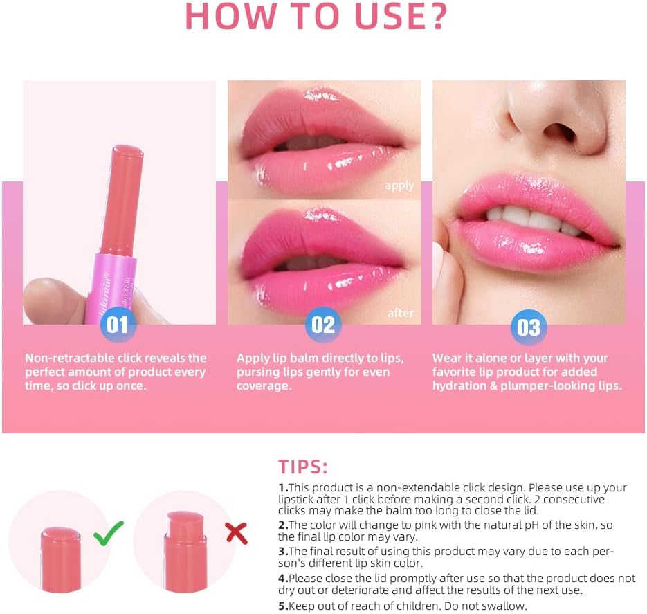 ?PH Color Changing?: Customize your own tinted shade of pink with our unique lipstick balm! This innovative formula seamlessly combines with your lips’ natural pH levels to create a personalized, bespoke color just for you. Enjoy instant, long-lasting high shine that glides on smoothly, leaving behind a non-sticky, comfortable feel
