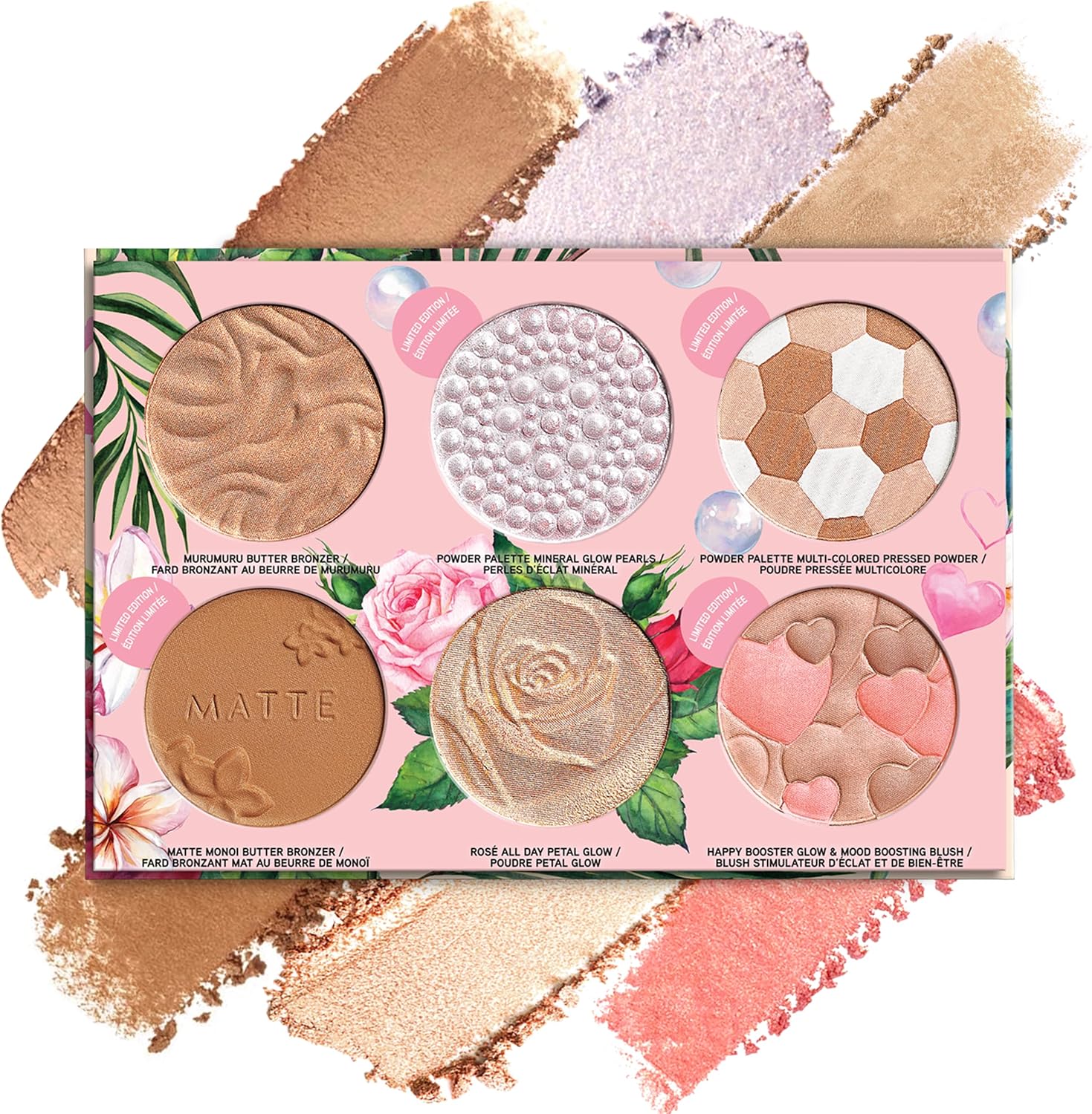 Shades: Murumuru Butter Bronzer, Matte Monoi Butter Bronzer, Rosé All Day Petal Glow Highlighter, Happy Booster Glow and Mood Boosting Blush, and Powder Palettes in Mineral Glow Pearls Highlighter and Face Powder