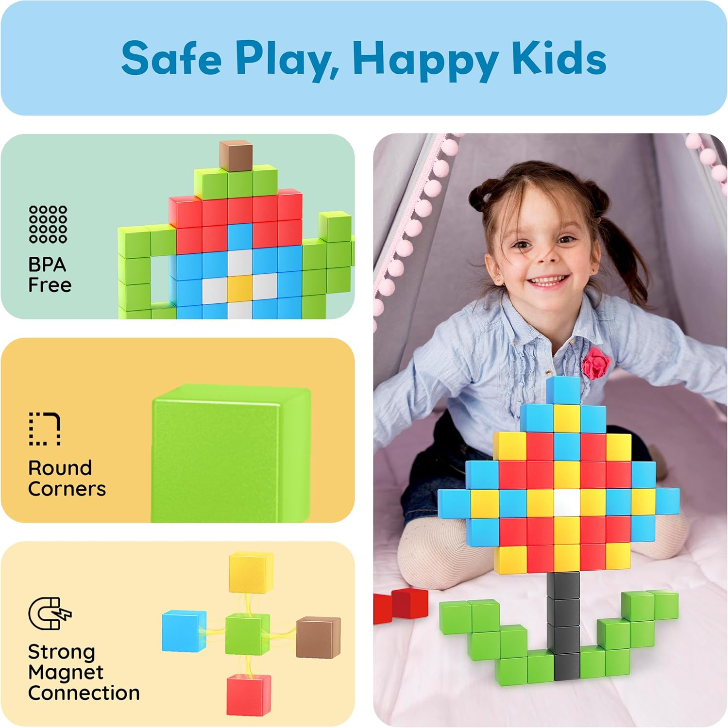OPEN-ENDED POSSIBILITIES, LEARNING IS FUN – It’s never too early to start developing children’s STEAM skills with visual learning sensory toys and magnetic cube construction magnet building block toy kit to gain strong sense of color, arts, geometrical shapes, number counting, 3D architectural design, and structural engineering for preschool kids, kindergarten child, pretend play, group activity, classroom, toddlers, teamwork, boys and girls age 3 4 5 and up to create unlimited design and shapes