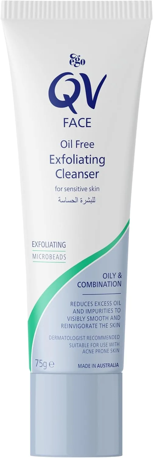 QV تم تركيب منظف تقشير الوجه الخالي من الزيوت بشكل علمي للبشرة الدهنية والمختلطة والعيوب والمعرضة لحب الشباب. يحتوي على حبيبات دقيقة للتقشير وينظف البشرة الدهنية بلطف دون أن يجف. مناسب للبشرة الدهنية المزدحمة، فهو يقلل من زيت البشرة.
