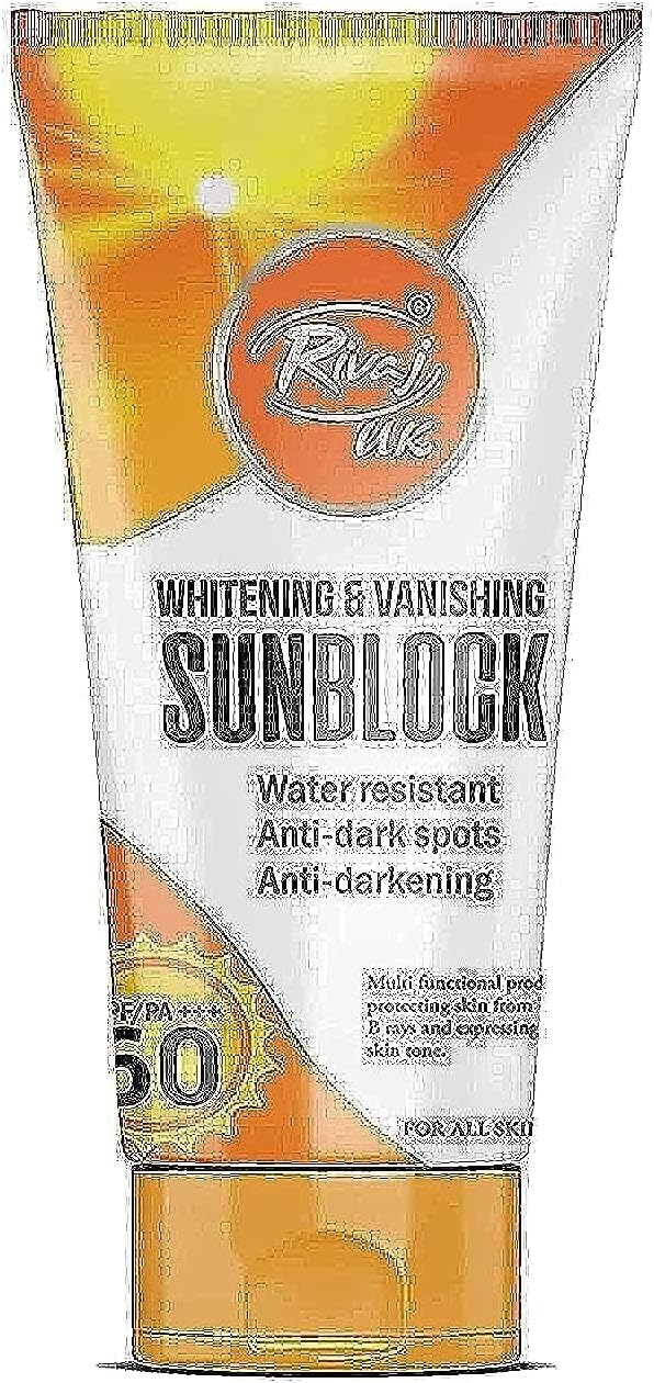Rivaj Uk Whitening And Vanishing Sunblock Water resistant Anti-dark Spots Anti Darkening. Multi functional product for protecting skin from UVA and B rays and expressign.
