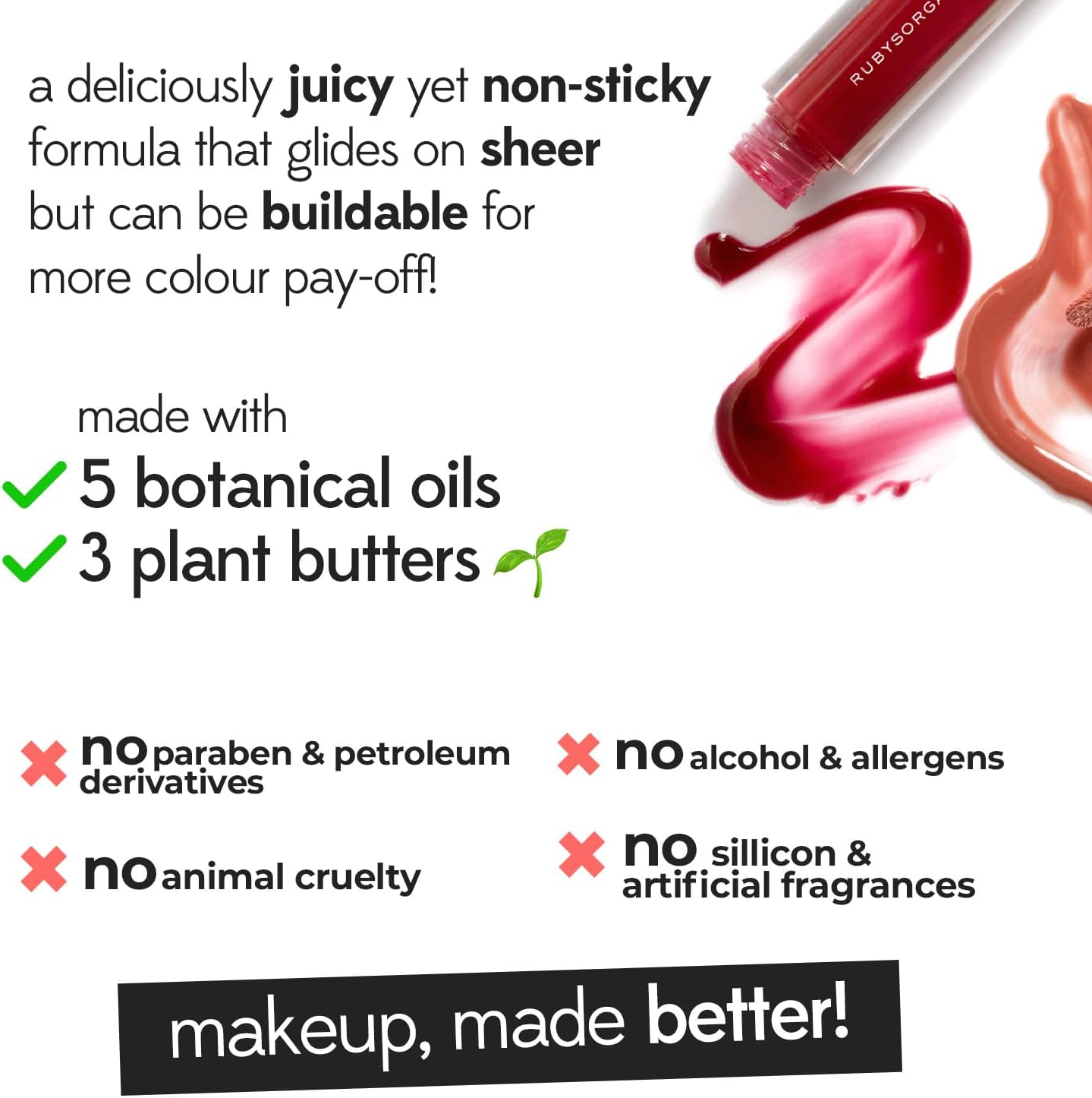 Ruby’s Organics lip gloss with a sheer tinted vegan formula that moisturizes lips, delivers the comfort of a lip balm and the look of a gloss. A non-sticky oil that glides on smoothly to give you a slick of colour perfect to wear on bare lips or over your favourite lipstick. How it is different? As the name suggests, this unique vegan oil gloss formula is packed with nourishing oils that are moisturizing and deliver comfort, without feeling thick or sticky. It glides on smoothly and effortlessly for a slick of tint on your lips. How to use?A non-sticky oil that glides on smoothly to give you a slick of colour perfect to wear on bare lips or over your favourite lipstick.