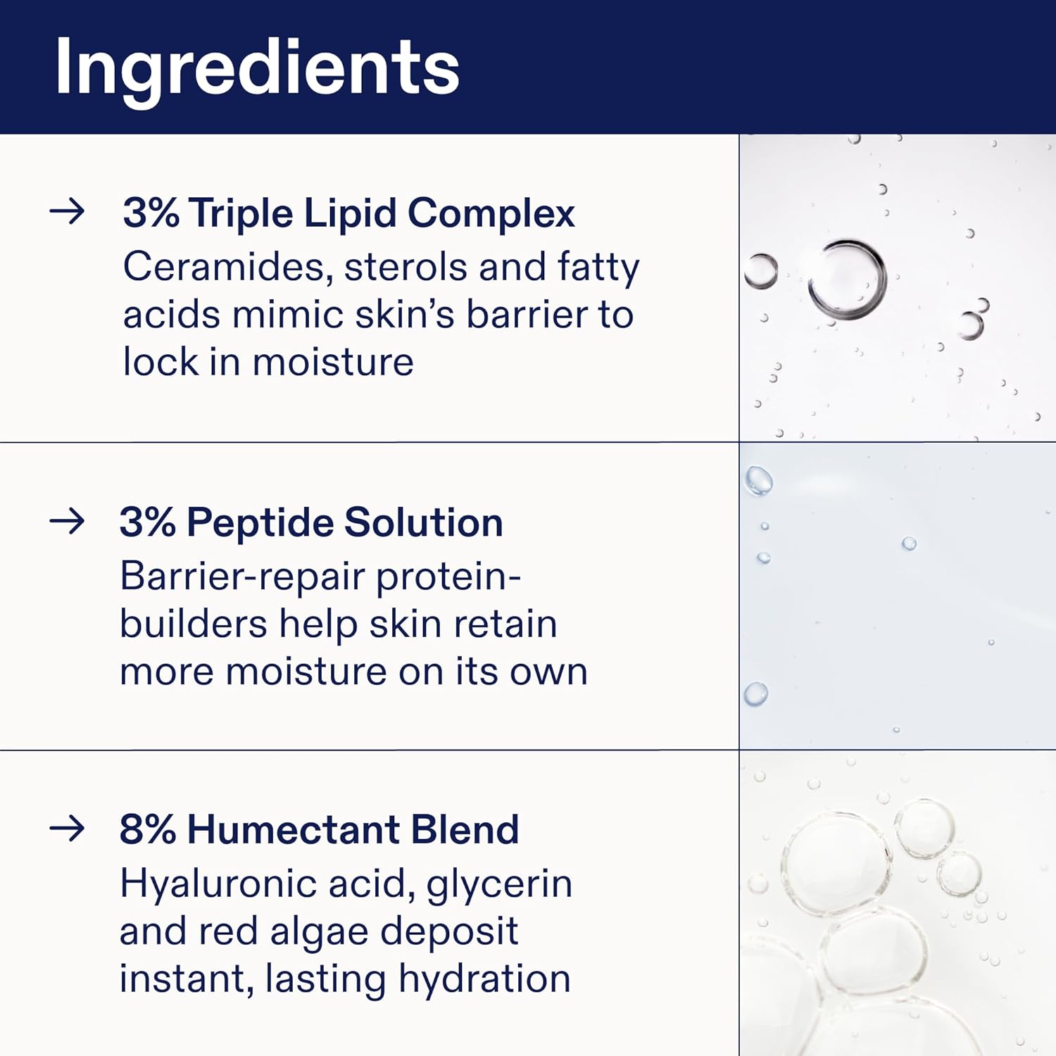 INGREDIENTS – 3% Triple Lipid Complex mimics skin’s barrier to lock in moisture. 3% Peptide Solution to weightlessly help skin retain moisture. 8% Humectant Blend with hyaluronic acid, glycerin & red algae for instant, lasting hydration.