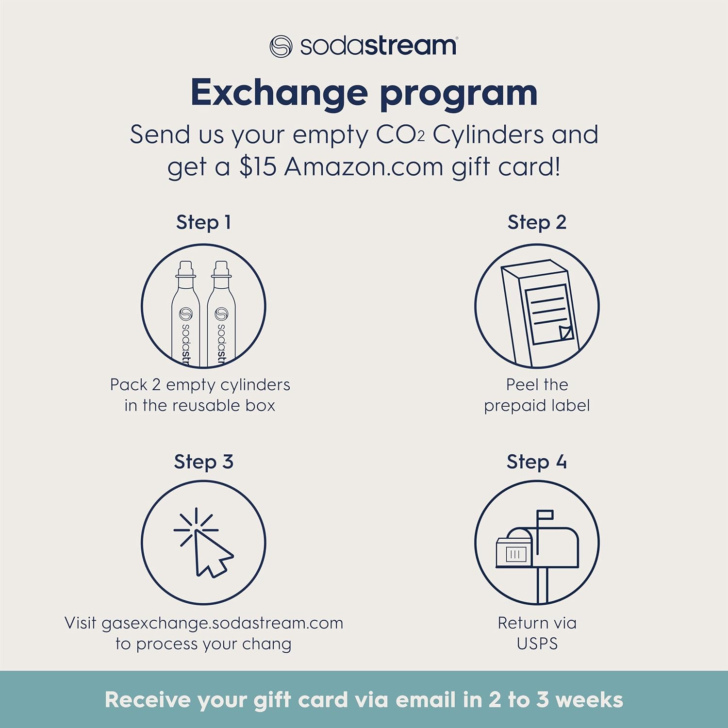 EARN A $15 GIFT CARD: Send back your 2 empty CO2 cylinders to receive a $15 Amazon Gift Card. Use the original shipping box with the USPS return label. Visit gasexchange.sodastream.com to process exchange. Gift card issued 2 weeks after receipt of empties