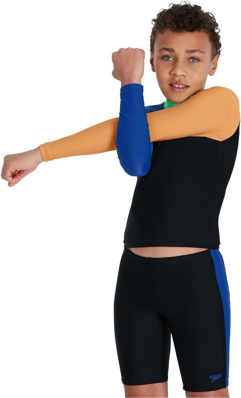 Speedo Colourblock Rashguard and Swimming Jammer Set for endless water adventures. Pool or beach there’s no stopping young swimmers from wearing our Long Sleeve Rash Top Set with a distinctive colorblock pattern. Perfect for outdoor swimming and long days at the beach. It is smooth, tight fabric with stretch offers comfort and flexibility. The rashguard has round neck with long sleeves. Elastic waistband swimming jammers. Measure 152 cm size.