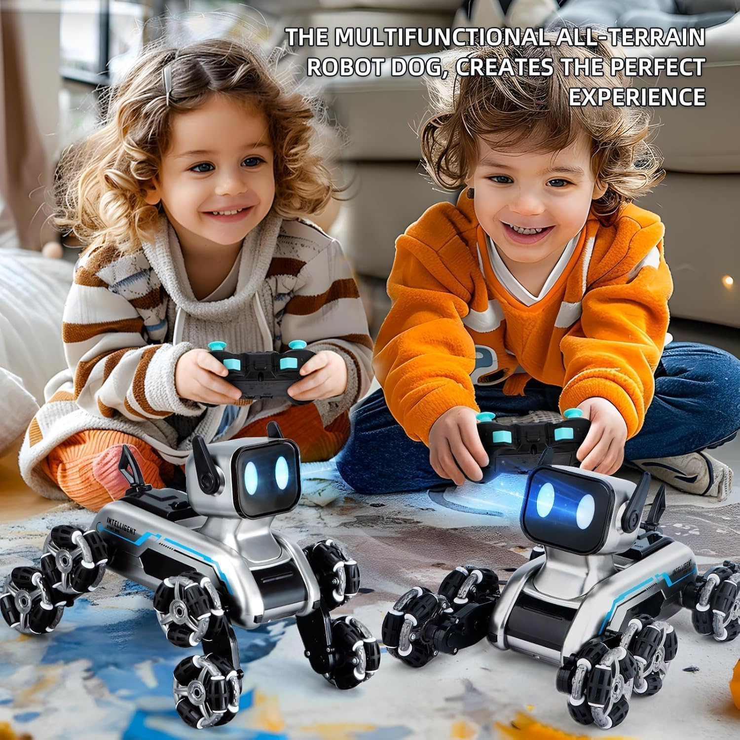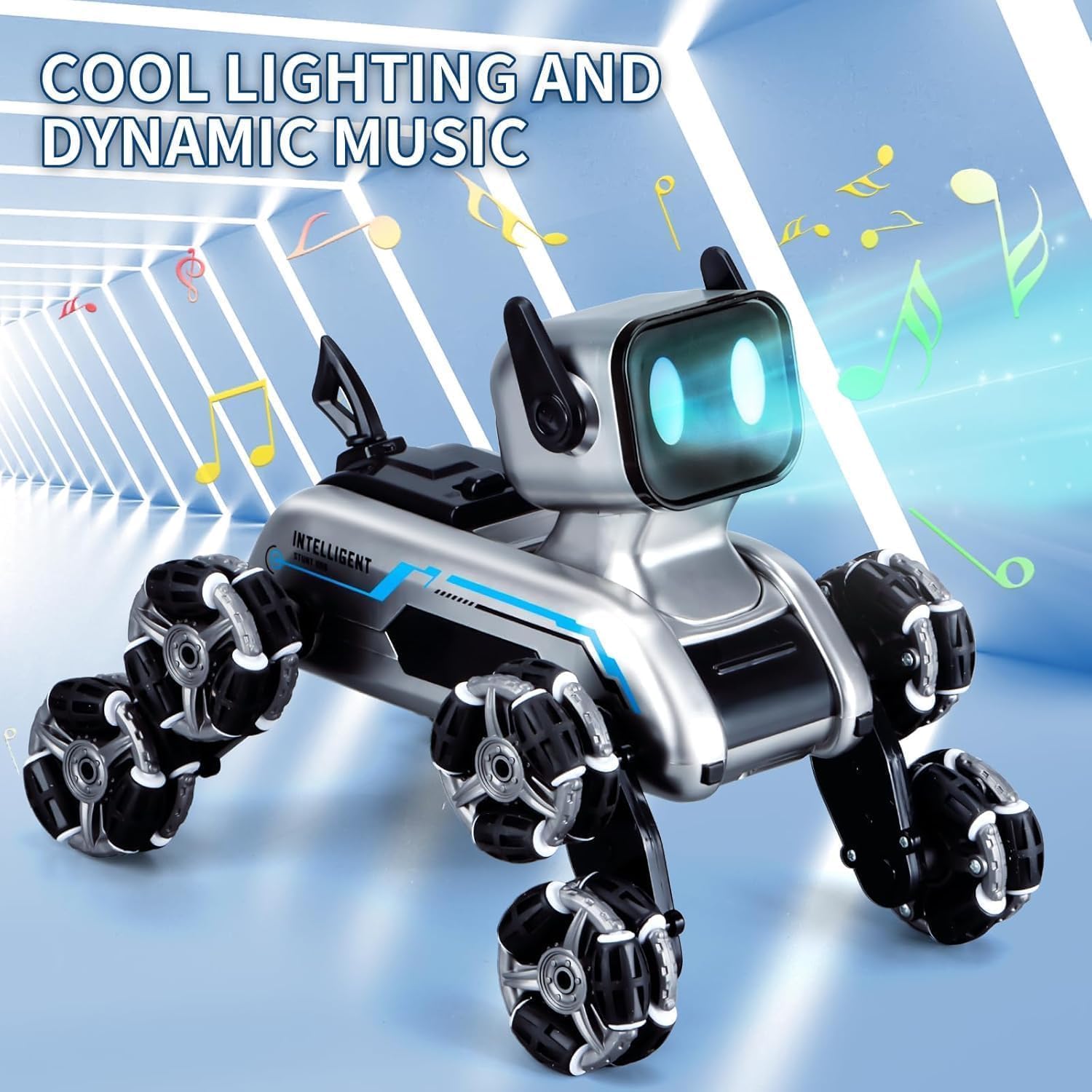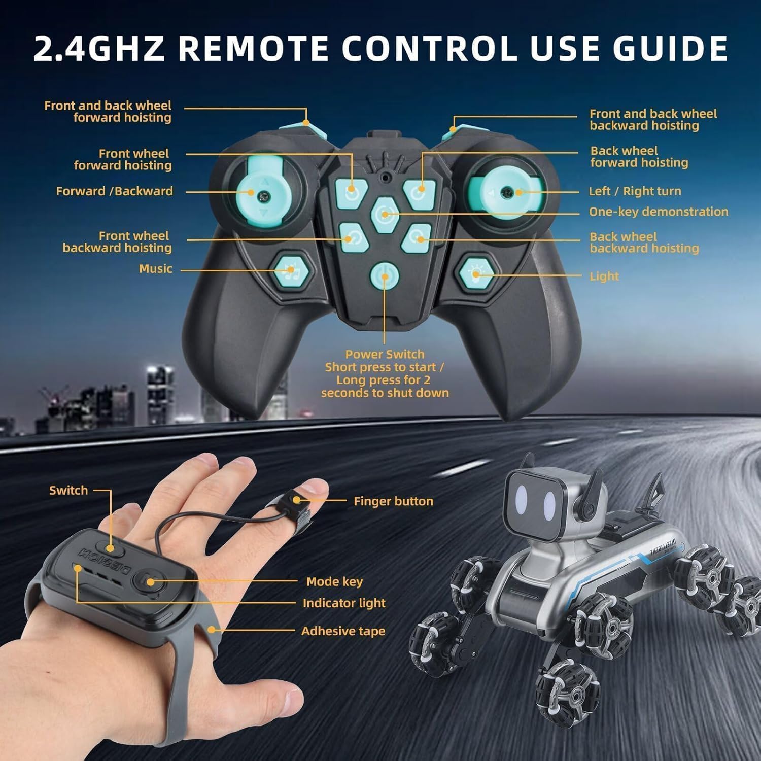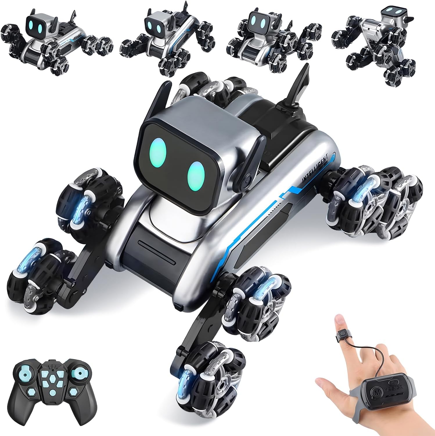 【8WD Remote Control Stunt Dog】:This wrist-controlled car is designed with a robot dog and has 8 wheels for incredible stunts and maneuvers. It can stand, lie, climb, move in all directions, rotate 360 degrees, and dance. This monster truck allows children to experience the fun and creativity of technology, allowing them to participate and enjoy hours of entertainment.