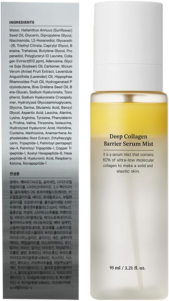 A mist that firms the skin with ultra-low molecular weight absorbent collagen. Instantly replenish with an absorbent collagen serum mist that addresses wrinkles, pores, and dryness all at once.