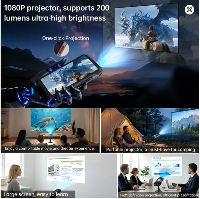 750nit 6.78″ LCD (1080×2460) Display Dimensity 8200 CPU Smartphone 5G Android 15 The first Rugged Phone with 220 lumens projector/Support 1080P