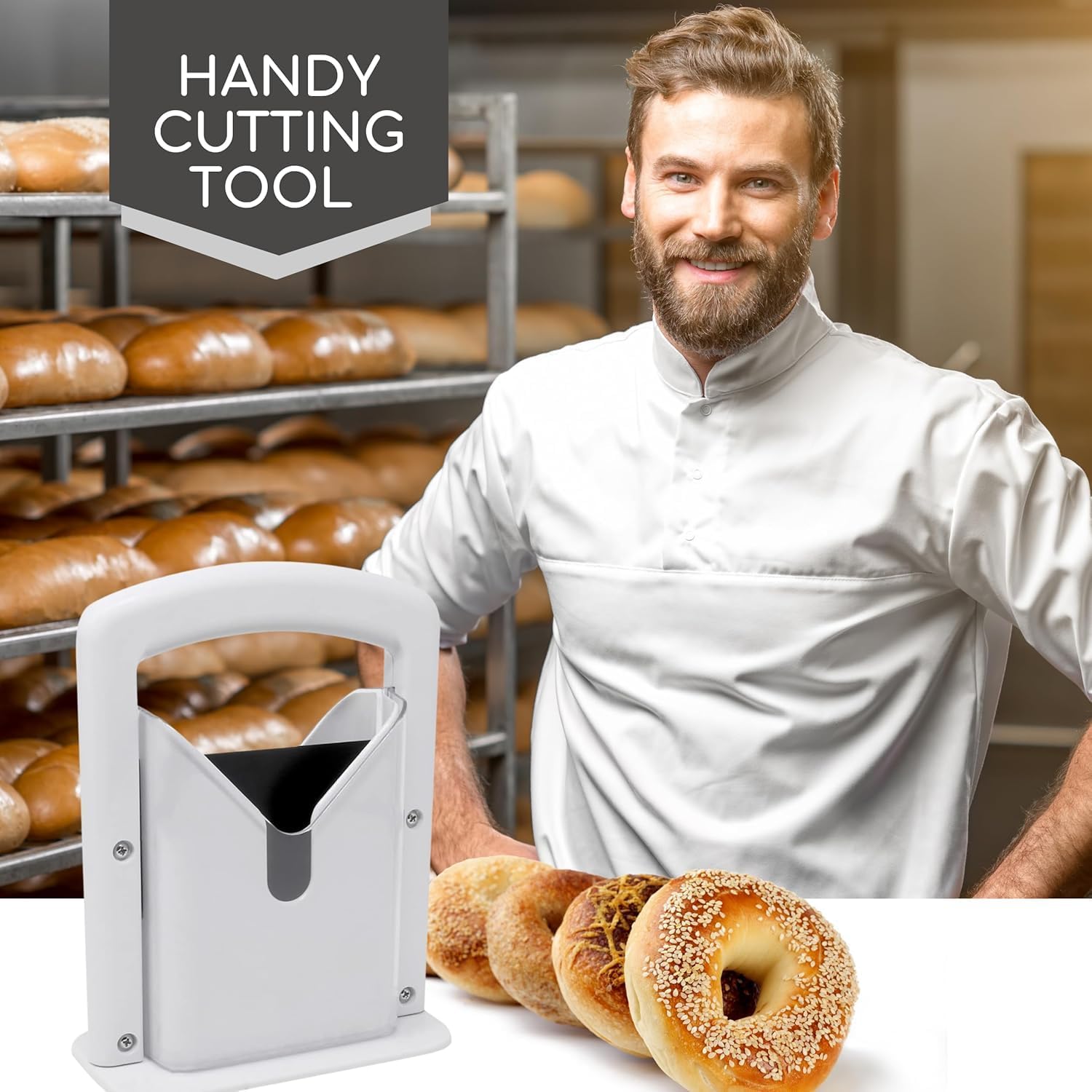 🥯【 Ergonomic Design】: The Adjustable bagel slicer has special blades that allow you to quickly and evenly cut bagels of any size. Thanks to this tool, you can easily and quickly cut bagels for hamburgers, burgers, sandwiches or for making croissants and other baked goods.