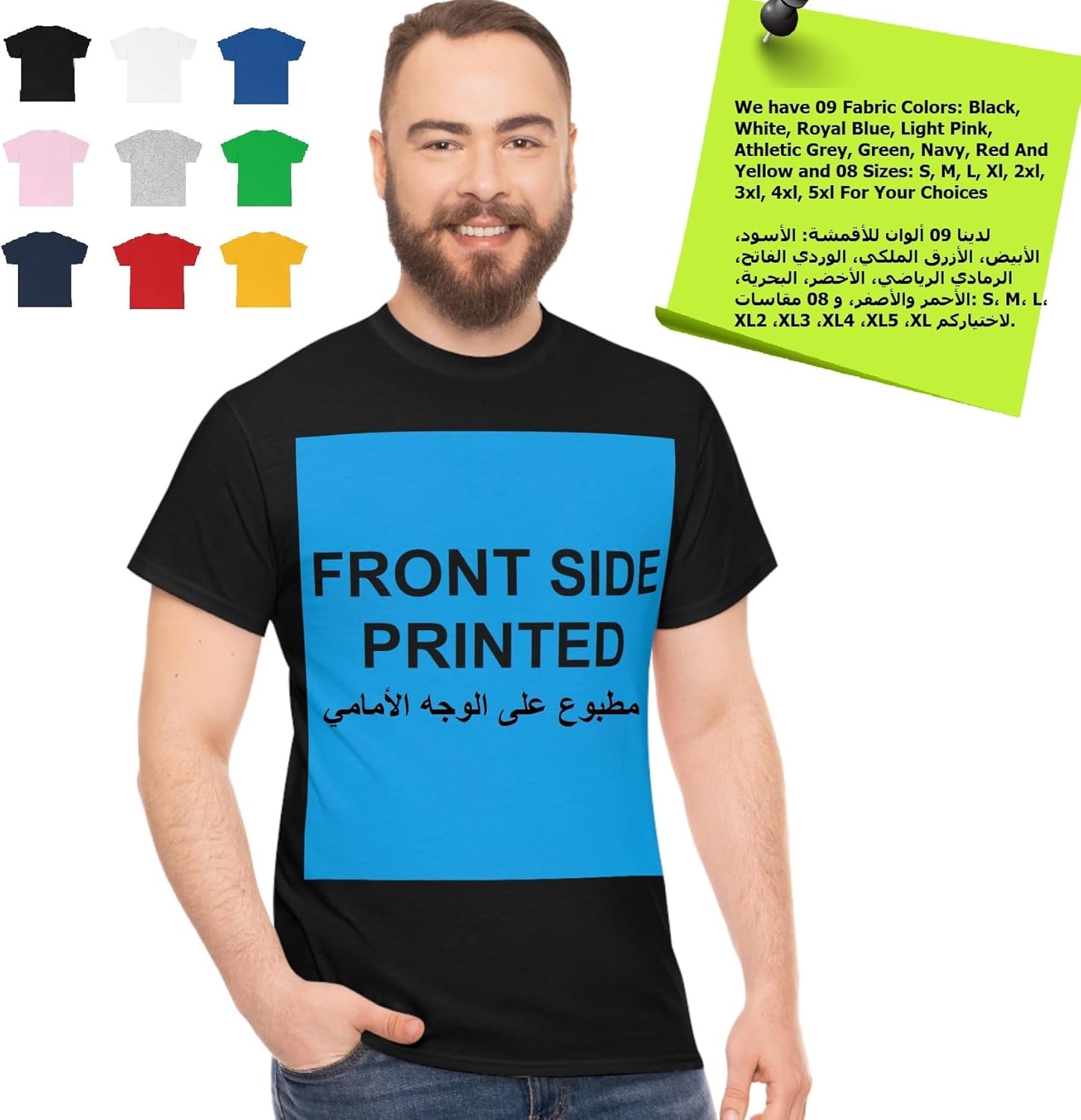 1. Many Choices: We can provide 09 fabric colors: Black, White, Royal Blue, Light Pink, Athletic Grey, Green, Navy, Red and Yellow with 08 sizes: S, M, L, XL, 2XL, 3XL, 4XL, 5XL for your choices. PLEASE SEND US A MESSAGE ALONG WITH YOUR ORDER TO LET US KNOW WHICH SIZE AND COLOR YOU WANT.