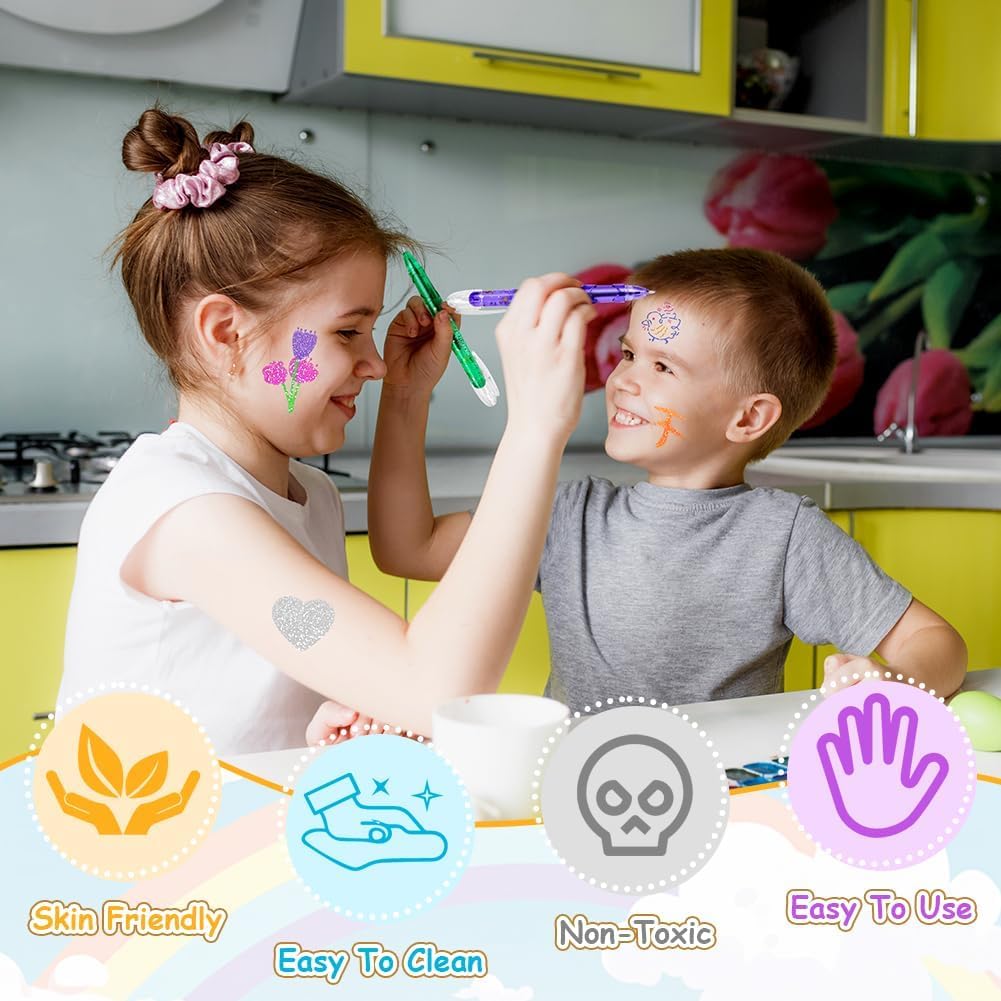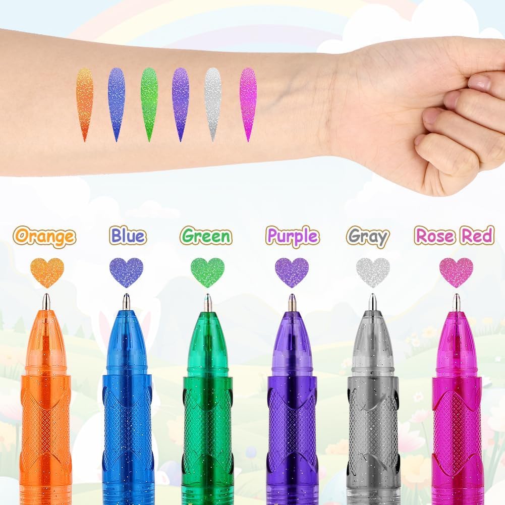 🎨Temporary Tattoo Pen Set: This set includes 6 vibrant glitter tattoo pens in colors: green, rose red, blue, purple, silver, and orange. Perfect for creating eye-catching body art, let your creativity shine through with a variety of colors.