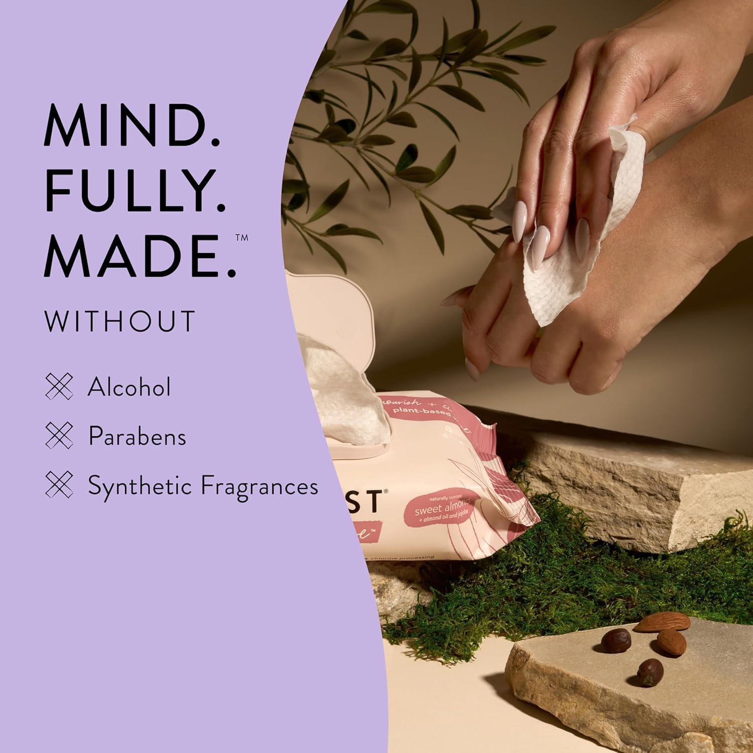 Our Nourish + Cleanse wipes are made with Jojoba + Almond Oil to nourish skin, and the dreamy natural sweet almond scent uplifts spirits.