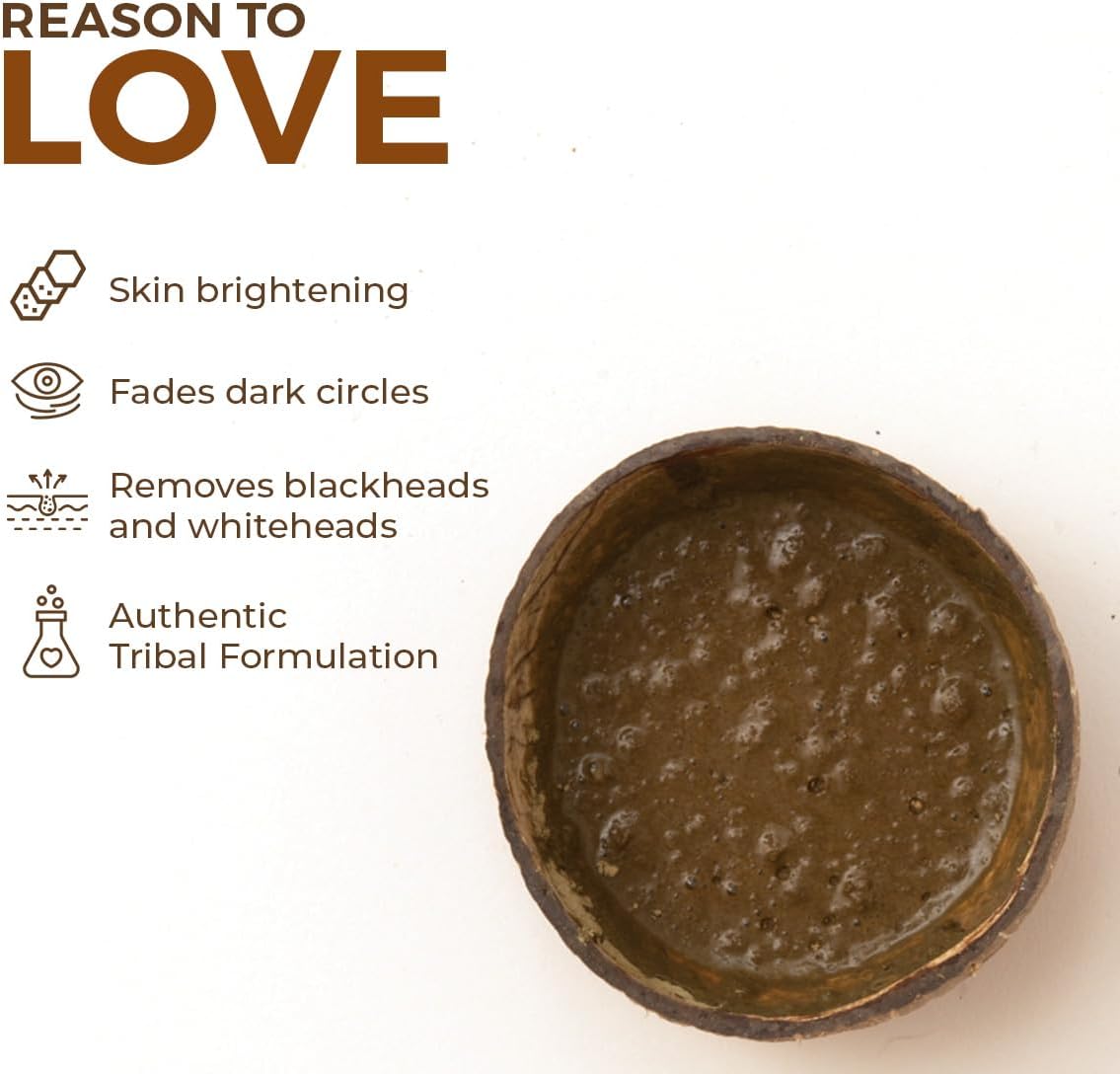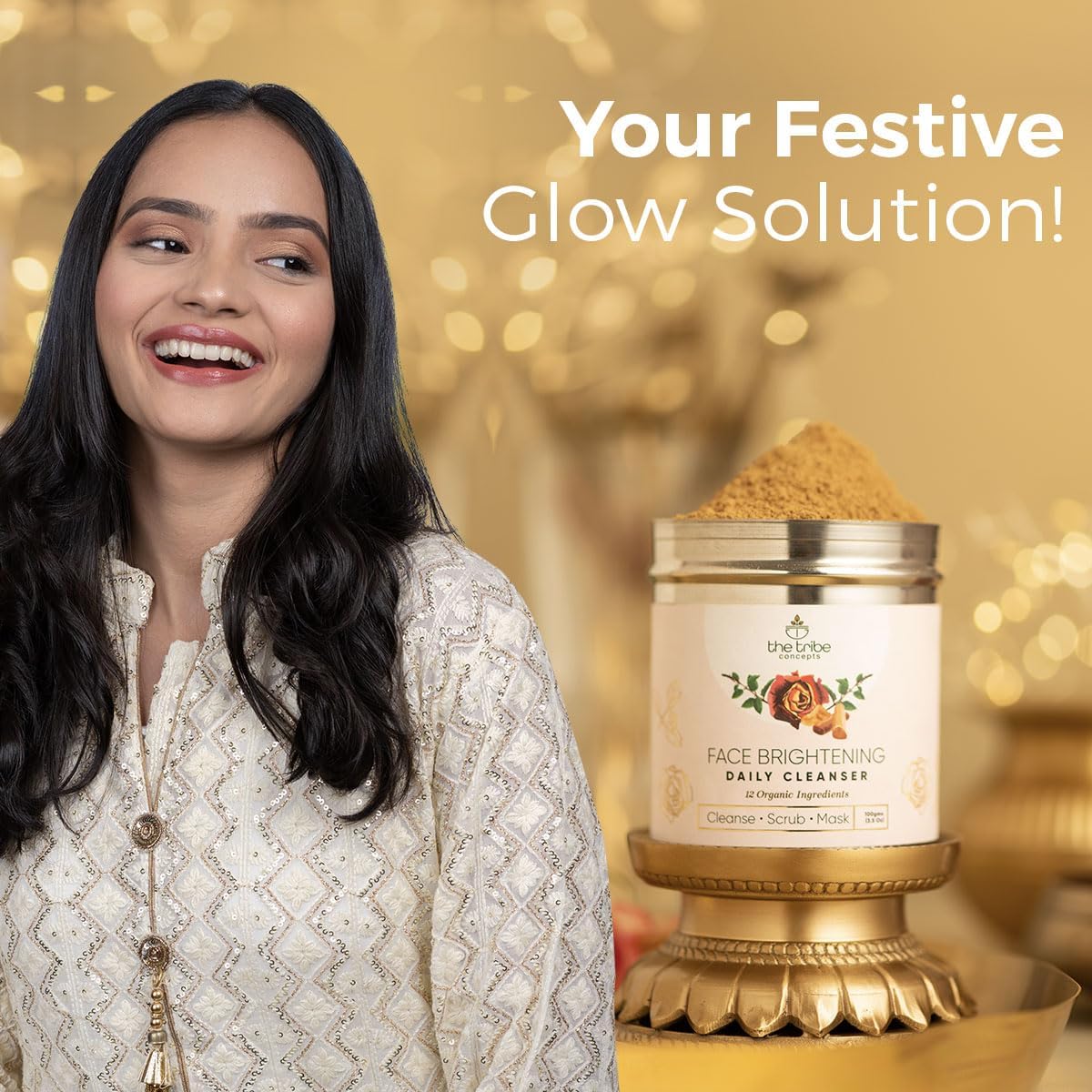 INSTANT BRIGHTENING GLOW Reveal a radiant complexion with every use. The Tribe Concept face mask for glowing skin unique blend of Rose Petals, Organic Sandalwood, Neem Leaves, and Wild Turmeric works together to brighten and even out your skin tone, giving you a fresh, glowing appearance.