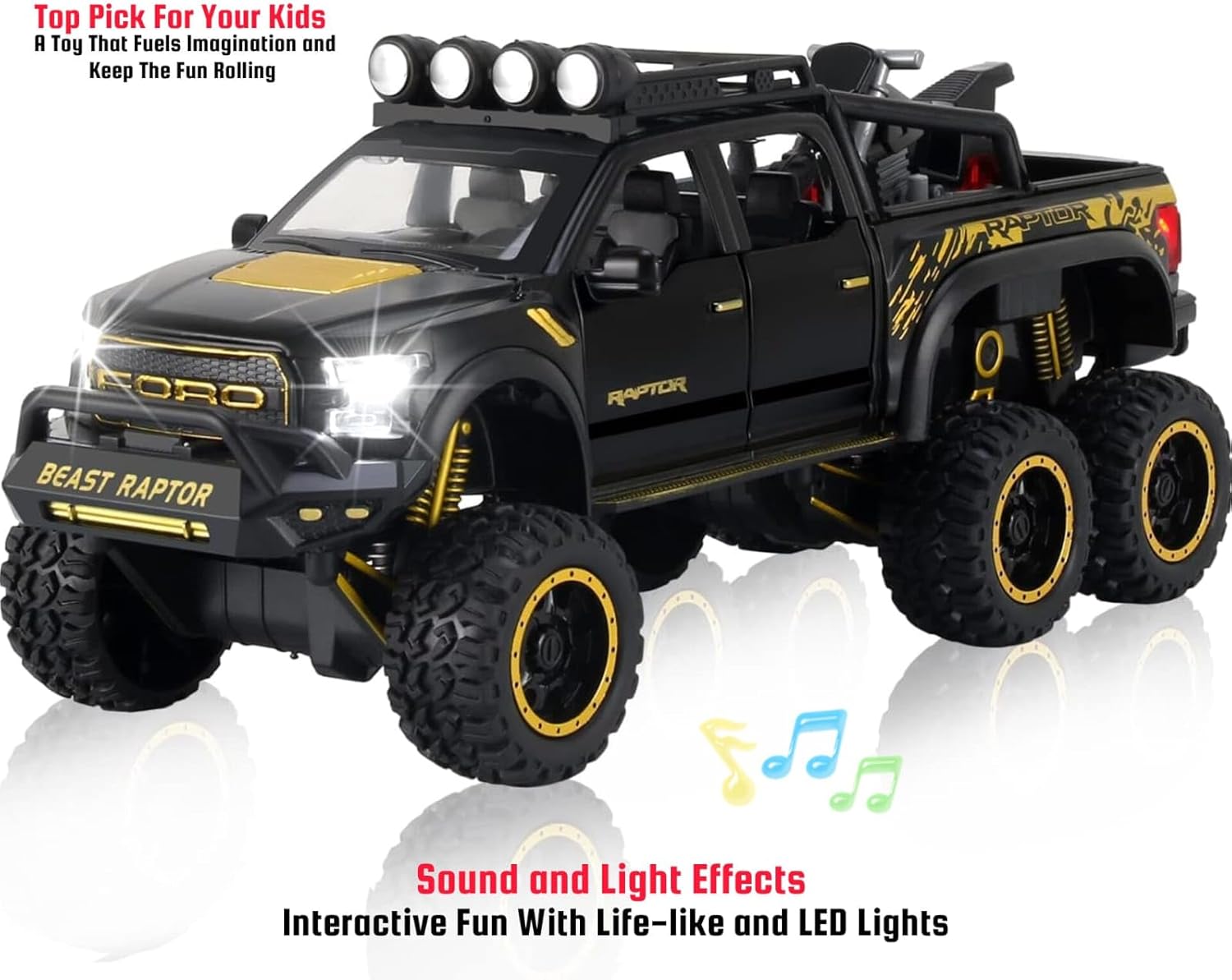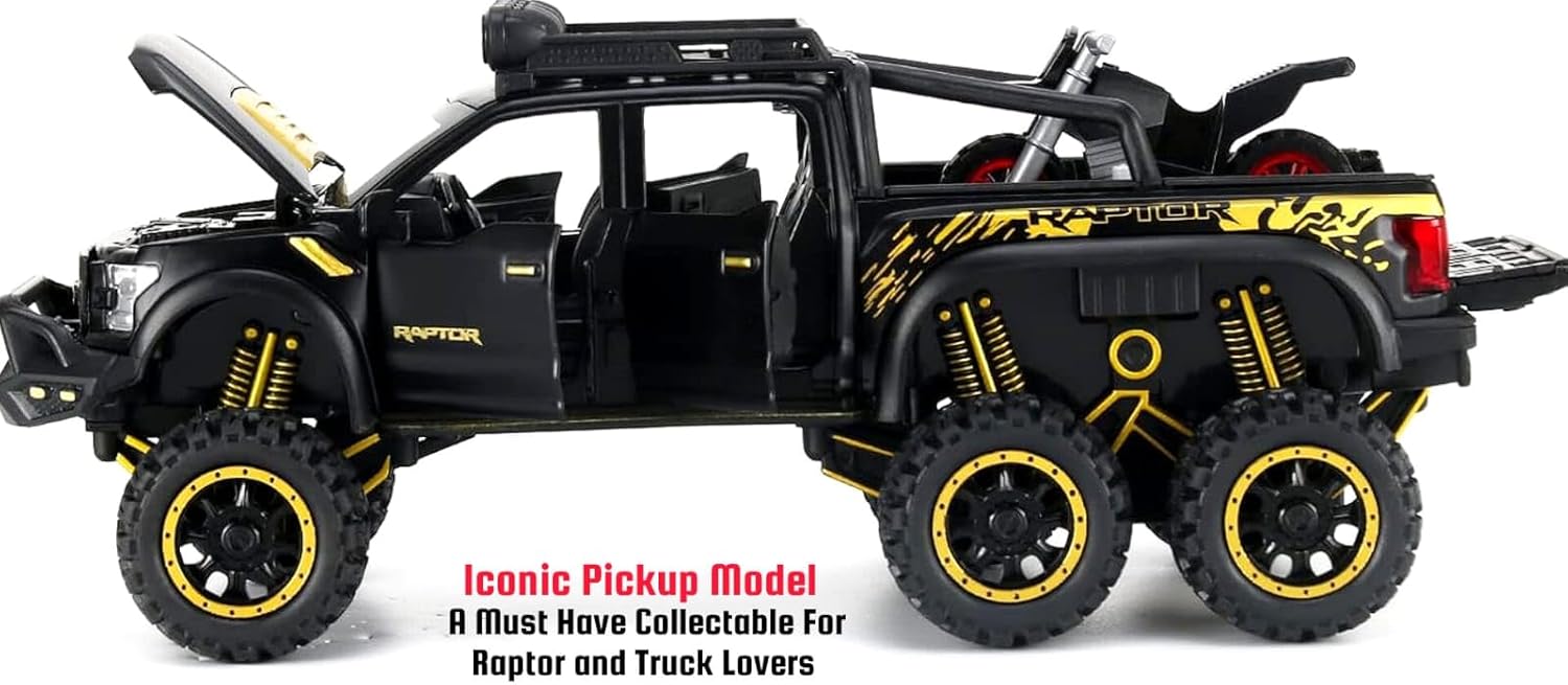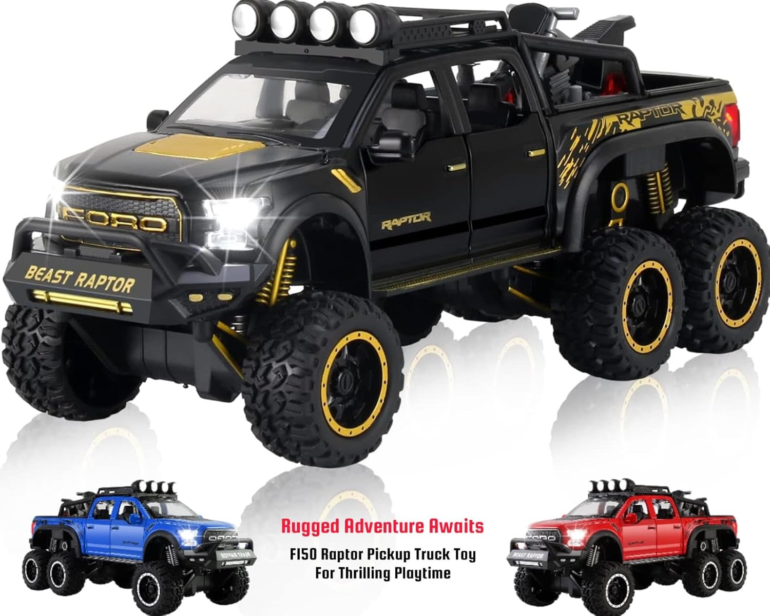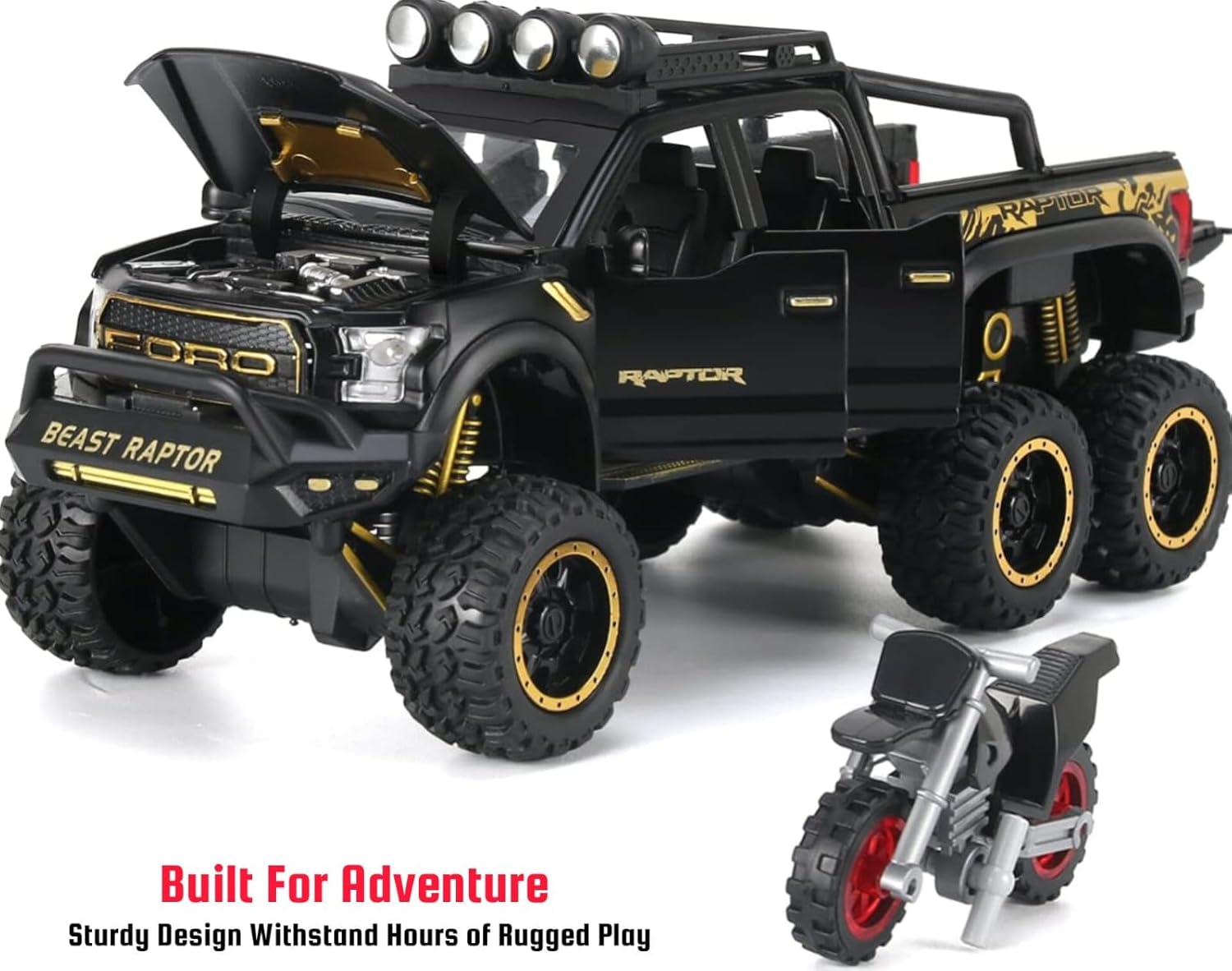 Unleash Adventure with the F150 Raptor Refitted 6×6 Pickup Truck Discover the thrill of exploration with our diecast metal F150 Raptor 6×6 Cross-Country Pickup Truck. This toy isn’t just a truck – it’s a journey into creativity and excitement. Its realistic details, from the opening doors and hood to the intricately designed engine and tailgate, make it a standout toy and collector’s item. Designed for both kids and adults, this 1:24 scale truck includes a decorative micro motorcycle, adding an extra layer of charm. The sturdy diecast metal build with durable rubber tires ensures that it can handle rugged play or sit proudly as a collectible. Engage All Senses with Interactive Features The truck’s working headlights and authentic engine sounds create a sensory-rich experience that captivates young minds. Its pull-back action and smooth rolling make it perfect for interactive and educational play, helping children enhance their motor skills and hand-eye coordination. A Gift for Every Occasion Whether it’s a birthday, Christmas, or a special surprise, this truck is sure to delight. Its unique design and functionality make it a great choice for kids aged 3 and up, as well as for truck enthusiasts seeking a decorative piece. Let the F150 Raptor Pickup Truck bring endless fun, imaginative adventures, and cherished memories to your family today.