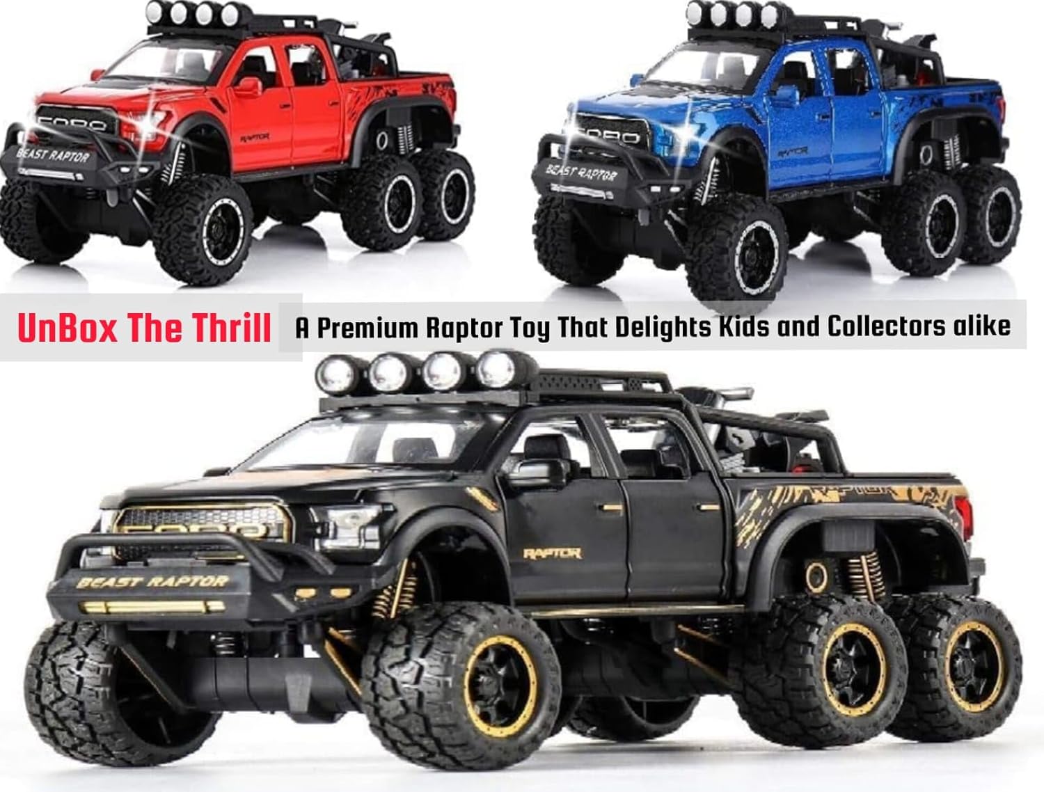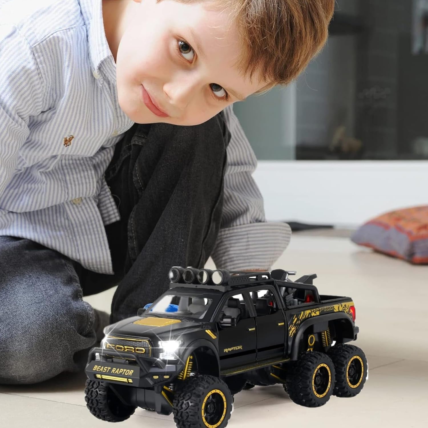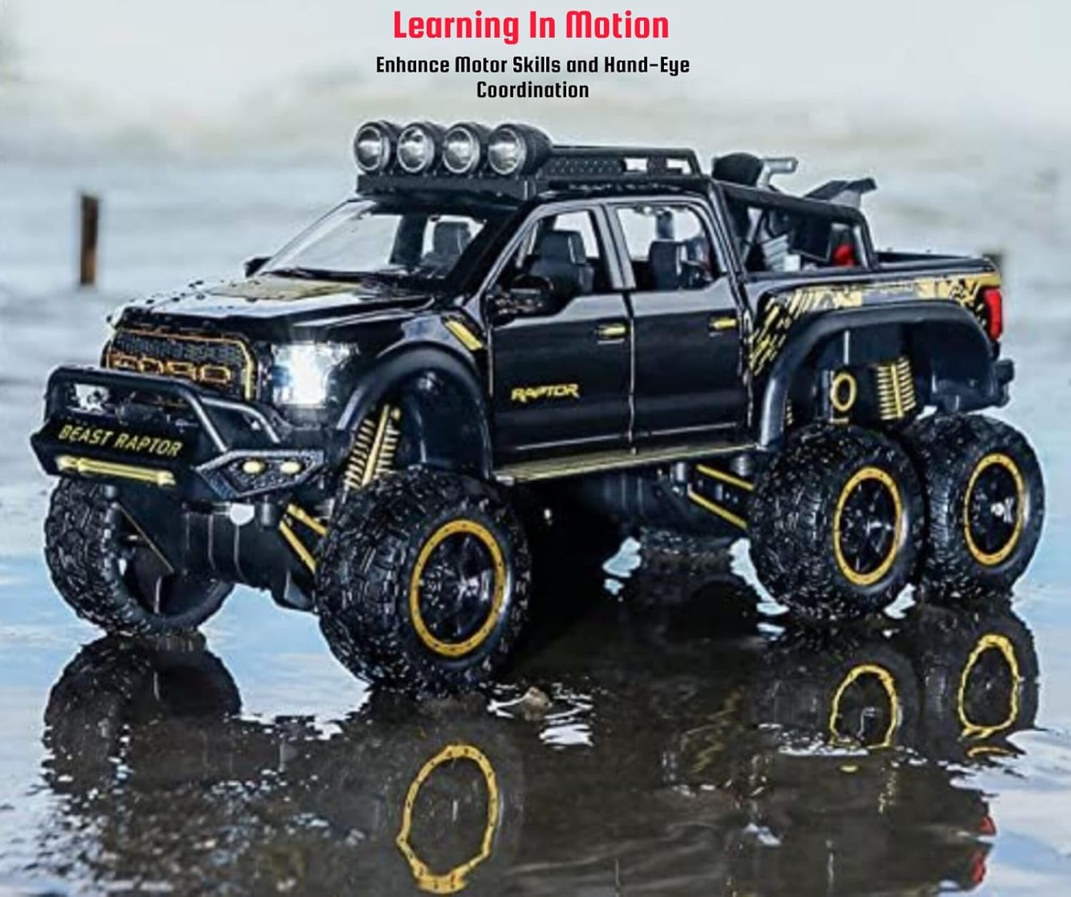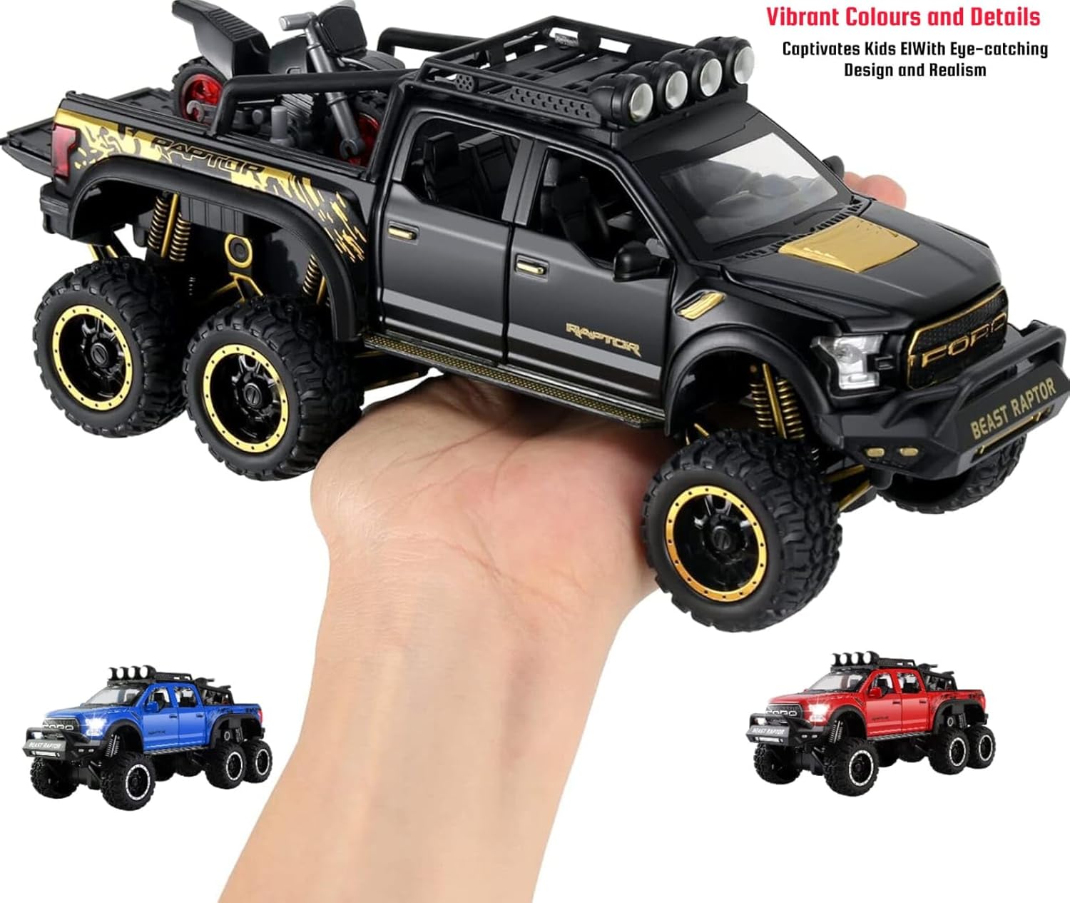 Unleash Adventure with the F150 Raptor Refitted 6×6 Pickup Truck Discover the thrill of exploration with our diecast metal F150 Raptor 6×6 Cross-Country Pickup Truck. This toy isn’t just a truck – it’s a journey into creativity and excitement. Its realistic details, from the opening doors and hood to the intricately designed engine and tailgate, make it a standout toy and collector’s item. Designed for both kids and adults, this 1:24 scale truck includes a decorative micro motorcycle, adding an extra layer of charm. The sturdy diecast metal build with durable rubber tires ensures that it can handle rugged play or sit proudly as a collectible. Engage All Senses with Interactive Features The truck’s working headlights and authentic engine sounds create a sensory-rich experience that captivates young minds. Its pull-back action and smooth rolling make it perfect for interactive and educational play, helping children enhance their motor skills and hand-eye coordination. A Gift for Every Occasion Whether it’s a birthday, Christmas, or a special surprise, this truck is sure to delight. Its unique design and functionality make it a great choice for kids aged 3 and up, as well as for truck enthusiasts seeking a decorative piece. Let the F150 Raptor Pickup Truck bring endless fun, imaginative adventures, and cherished memories to your family today.
