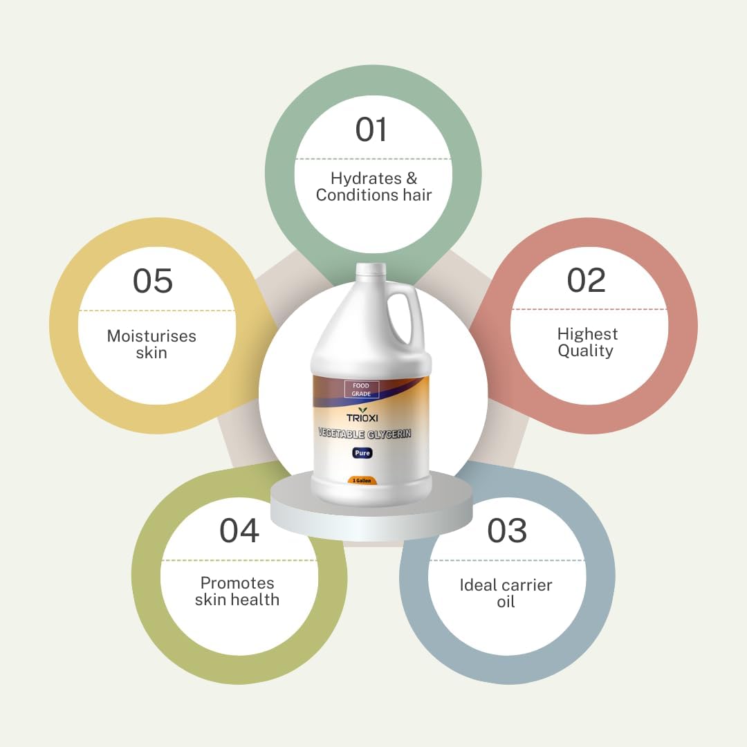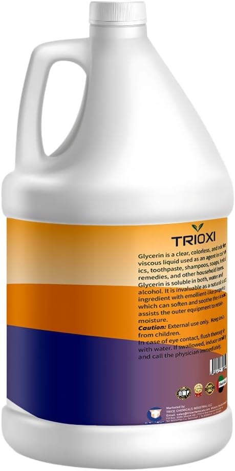 Pure organic vegetable glycerin is an outstanding moisturizer and skin cleanser that also provides softening and lubricating benefits. It’s easily soluble in water, making it suitable for use in all of your favorite cosmetic applications. Pure organic vegetable glycerin has a long shelf life and does not easily oxidize. Trioxi Organic Vegetable Glycerin 1 Gallon is your go-to choice for a versatile, high-quality glycerin that meets the highest standards of purity and performance. Crafted from 100% organic plant sources, this vegetable glycerin is an essential ingredient for various applications, including skincare, hair care, and DIY projects. Its exceptional hydrating and moisturizing properties make it ideal for use in facial creams, body lotions, shampoos, conditioners, and more. The 1-gallon size provides an ample supply for both individual users and businesses, ensuring you have enough of this valuable ingredient for all your needs. Whether you’re creating homemade beauty products, formulating high-quality personal care items, or engaging in craft projects, Trioxi Organic Vegetable Glycerin offers a natural and effective solution. Its gentle nature makes it suitable for all skin types, including sensitive skin, and its plant-based origin supports eco-friendly and sustainable practices. Enhance your formulations with Trioxi Organic Vegetable Glycerin and experience the benefits of pure, organic hydration. Applications Skincare Products: Used in moisturizers, serums, and creams to hydrate and soften the skin. Hair Care: Added to shampoos, conditioners, and hair masks to provide moisture and enhance shine. DIY Beauty Products: Ideal for making homemade lotions, balms, and scrubs due to its moisturizing properties. Soap Making: Acts as a humectant in homemade soaps, helping to retain moisture. Cosmetic Formulations: Used in formulations for lip balms, facial masks, and other cosmetic products to improve texture and hydration. Crafting: Useful in various crafting projects, including homemade candles and bath products. Food Industry: Can be used as a sweetener or moisture-retaining agent in some food products (ensure it meets food-grade standards). Pharmaceuticals: Employed in certain pharmaceutical preparations as a soothing agent.